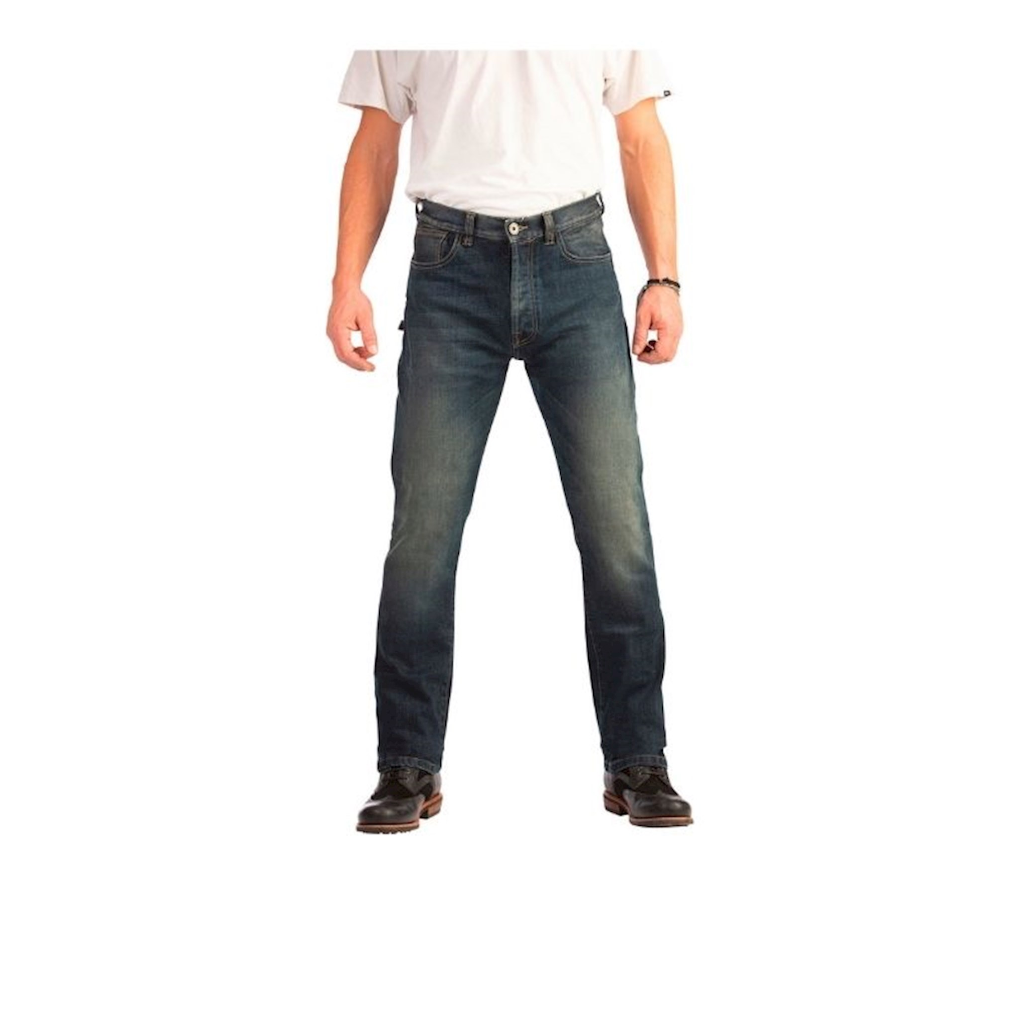 - Highly abrasion resistant single layer motorcycle jeans with five-pocket style - Slim fit with tapered leg - Finest 14 oz Denim with high abrasion resistant UHMWPE fibres - Vintage wash - Protector pockets on knee and hips for maximum safety - Without rivets which could scratch the bike - Easy care
