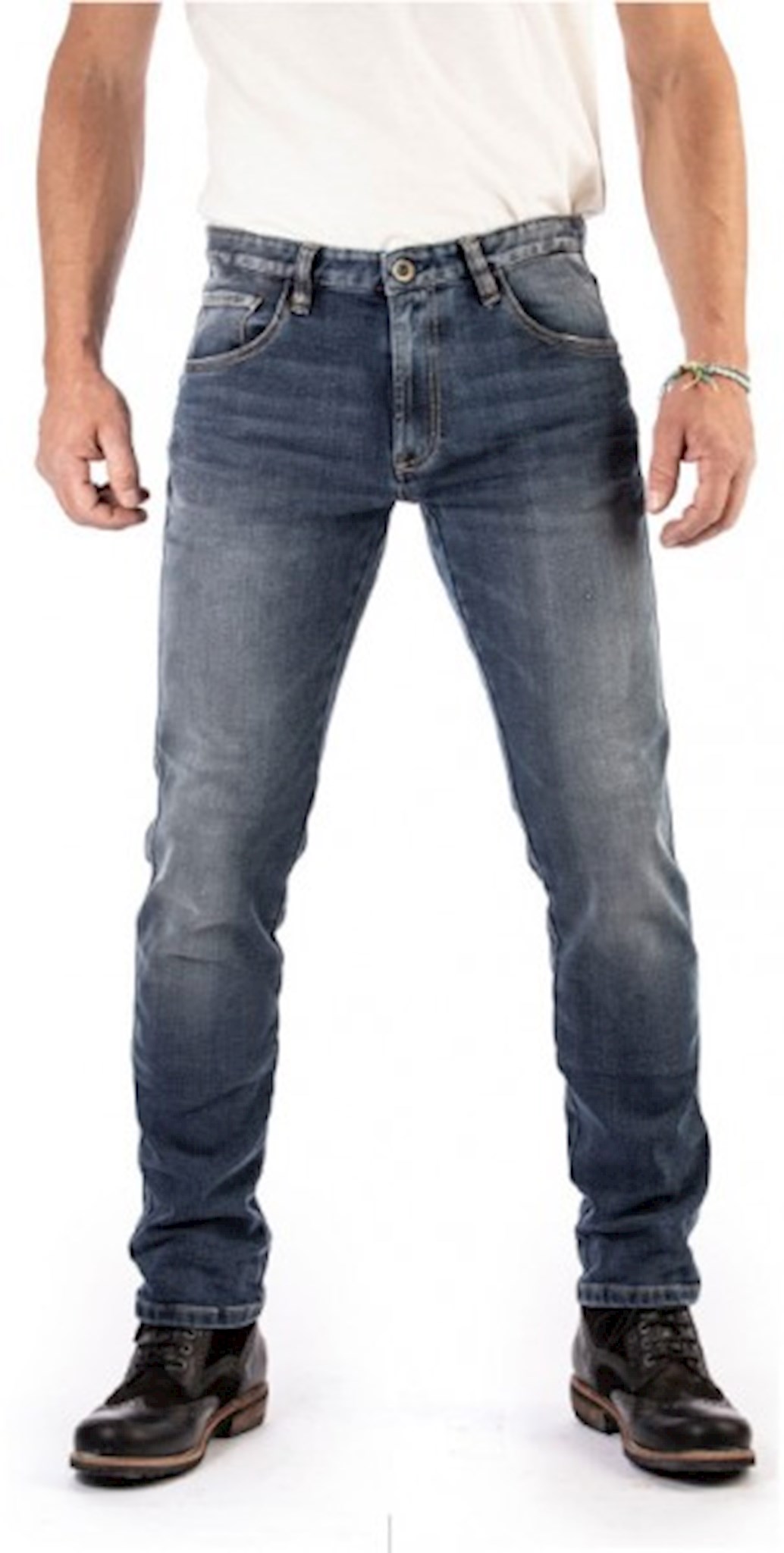 Abrasion resistant: High abrasion-resistant, single-layer motorcycle jeans in five-pocket style · CE certification: Level AA · Breathable: No sweating even in hot temperatures · Fit: Tapered slim fit with zipper · Material: Finest, high abrasion resistant blue stretch denim made of UHMWPE fibres (61%CO, 19%PE, 11%PA, 8%EME, 1%EA), 12oz, 25% elasticity · Protector pockets: Integrated at hips and knees (height adjustable) for maximum safety · Protectors: Latest extra flat removable D3O® Ghost knee and hip protectors included · Production: Made in Portugal from fair production · No rivets: Prevents scratching your motorcycle · Care instruction: washable at 30°, ironing at low temperature