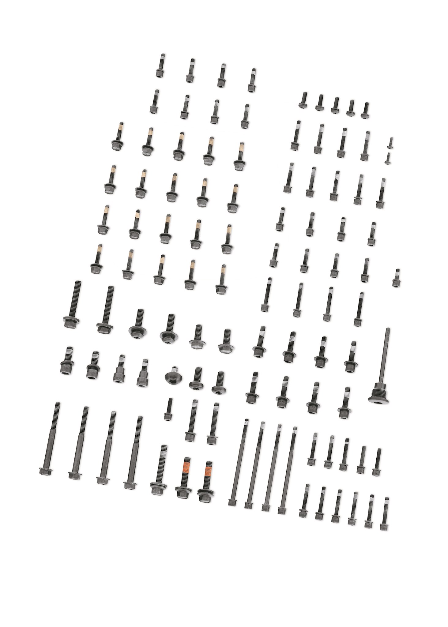 Durable and easy-to-install, this gloss-black engine hardware adds a custom touch to the blacked-out look of your motorcycle. Kits include the hardware required to replace all of the visible zinc-plated fasteners on the vehicle's engine, primary, rocker boxes, derby or cam covers. Lock patch included where required. Includes the hardware required to replace the visible set of zinc-plated fasteners on the primary cover, derby cover, transmission side and top covers, tappet covers, cam covers and rocker box covers.