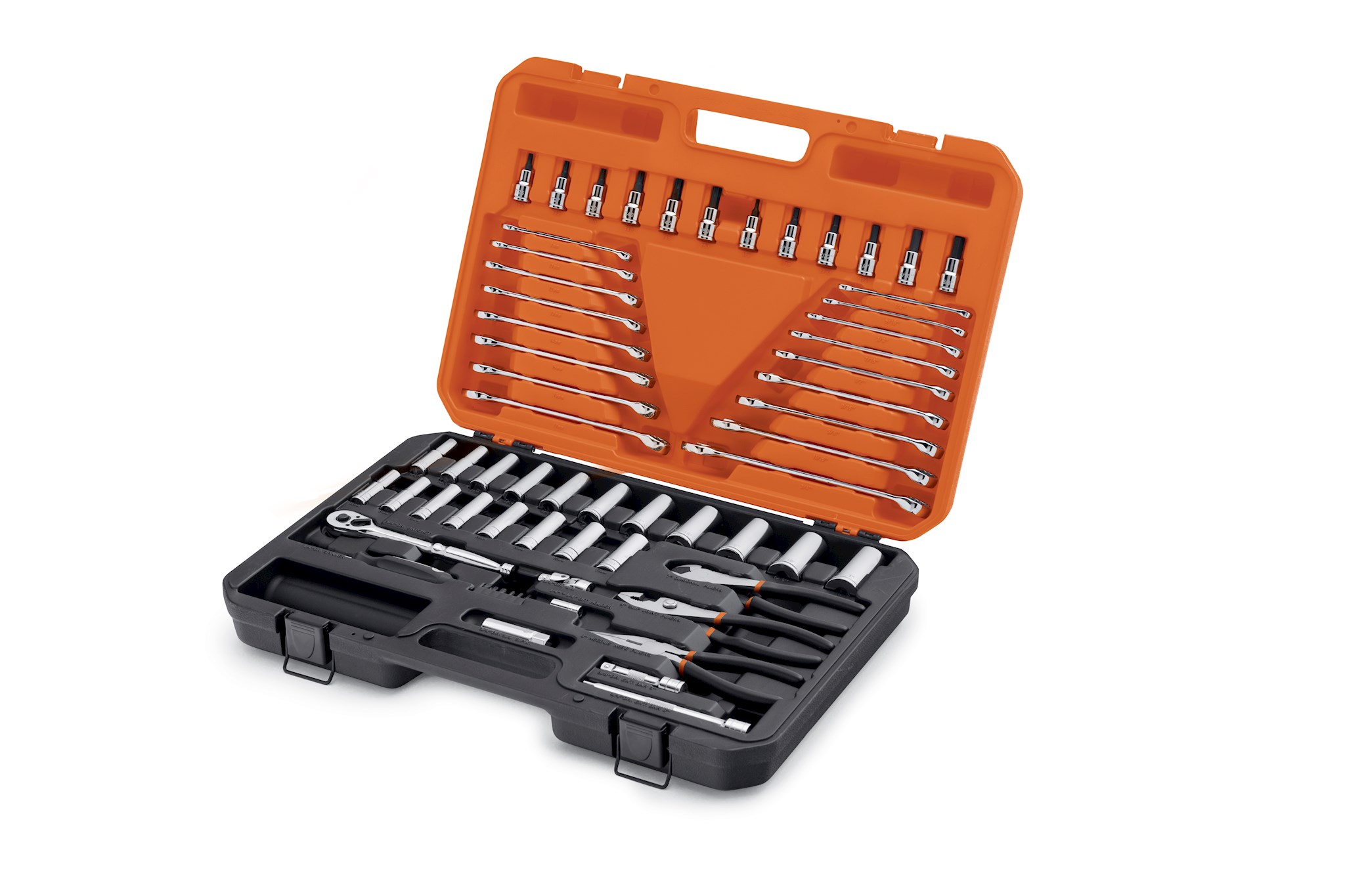 This Premium Harley-Davidson® branded Tool Kit features all the tools you need for common maintenance on your motorcycle. The heavy-duty tools are conveniently secured in a hinged carrying case, and lock in place for simple organization. Tools feature large, easy-to-read size indicators, and are stamped with the classic Harley-Davidson script. Lifetime warranty. 1 - Quick-Release Ratchet (3/8" Drive) 1 - 3" Extension (3/8" Drive)1 - 6" Extension (3/8" Drive)1 - Universal Joint (3/8" Drive)11 - SAE Deep Sockets 3/8" - 1" (3/8" Drive)8 - Metric Deep Sockets 10mm - 17mm (3/8" Drive)1 - Spark Plug Socket 5/8" (3/8" Drive)6 - Hex Sockets 1/8" - 3/8" (3/8" Drive)6 - Torx® Sockets T25-T50 (3/8" Drive)2 - Spinner Handle (1/4" Drive) with Adaptor6 - Bits (Slotted, Phillips, Torx)9 - SAE Combination Wrenches 1/4" - 3/4"8 - Metric Combination Wrenches 8mm - 17mm1 - Diagonal Pliers - 7"1 - Slip Joint Pliers - 8"1 - Needle Nose Pliers - 8"