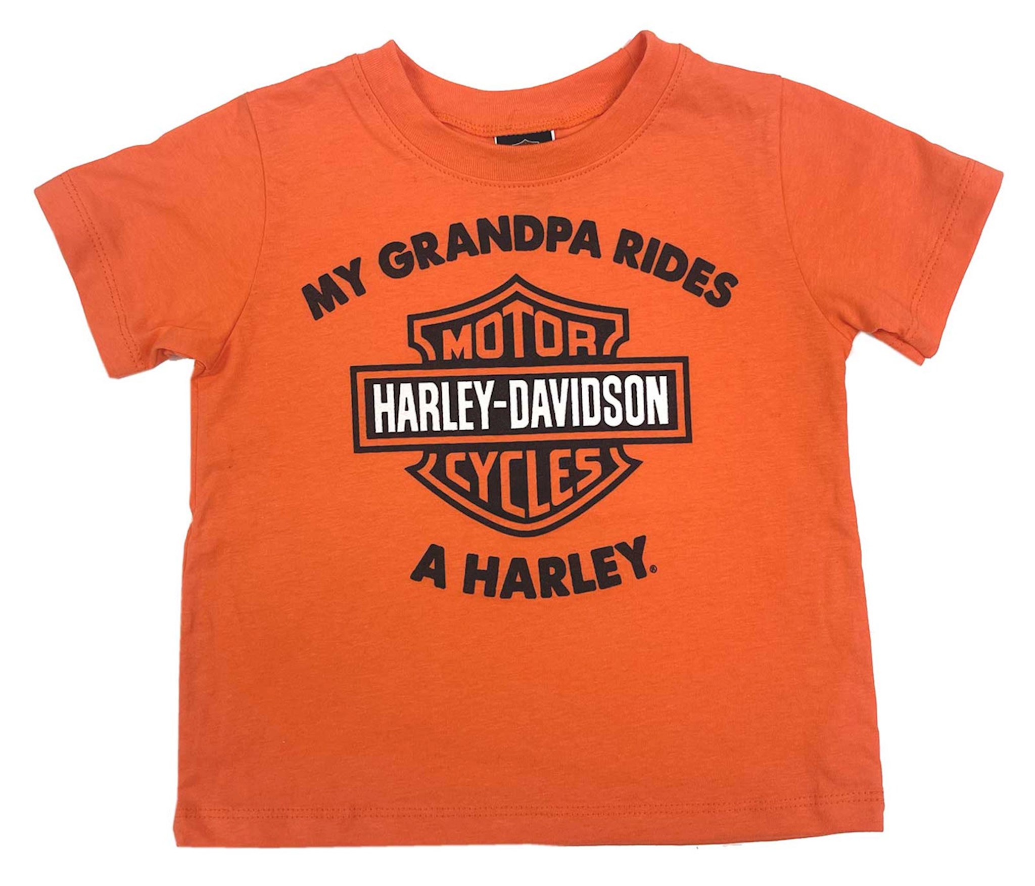 Harley-Davidson® Little Boy's Toddler Short Sleeve Tee, Bright Orange. Made from 100% cotton, very soft and comfortable for your little guy. Iconic Bar & Shield graphic screen printed on front including 'My Grandpa Rides a Harley®' script.