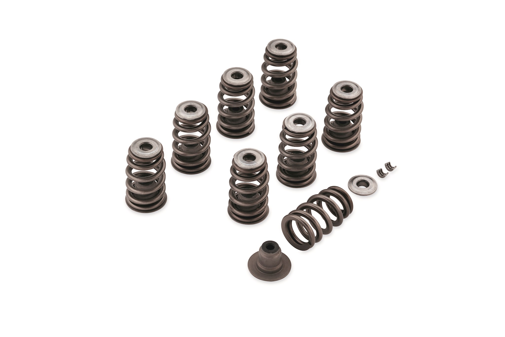 These performance beehive-shaped valve springs provide increased stiffness and strength in a compact design. Designed to support the installation of higher lift cams, these performance springs help maintain the stability of the valve train in high RPM conditions. Complete kit includes 8 springs, upper collars and keepers and lower collars with integral valve seals.