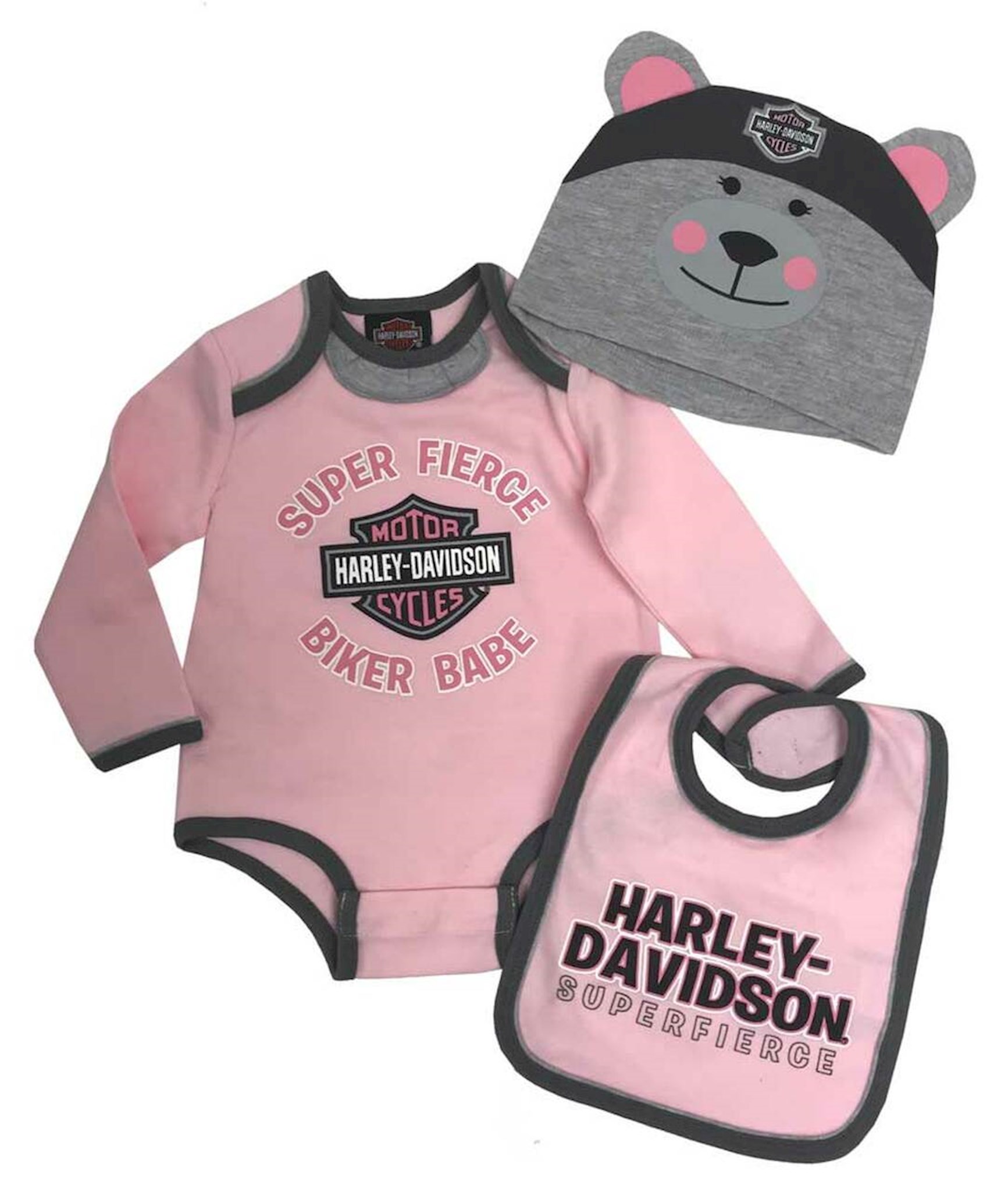 Harley-Davidson® Baby Girl's 3D Bear Newborn Creeper Set w/ Hat & Bib - Pink, 2504909. Soft and light-weight, all items are made from 60% cotton and 40% polyester. Absolutely adorable 3D bear hat accented with light pink. Adorable "Super Fierce Biker Babe" graphic with Bar & Shield logo screen printed on front. Three bottom snap closure. Harley-Davidson® screen printed on bib with a velcro closure. Perfect for your little Harley gal!