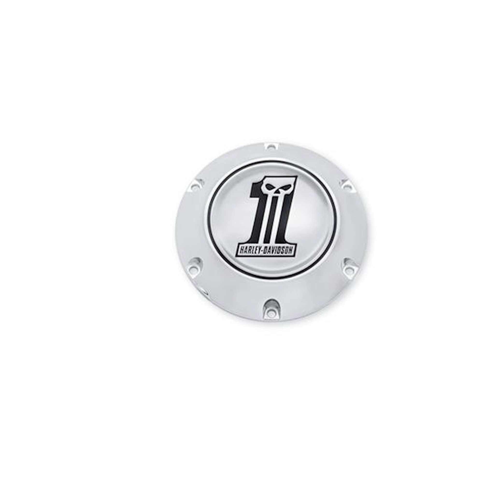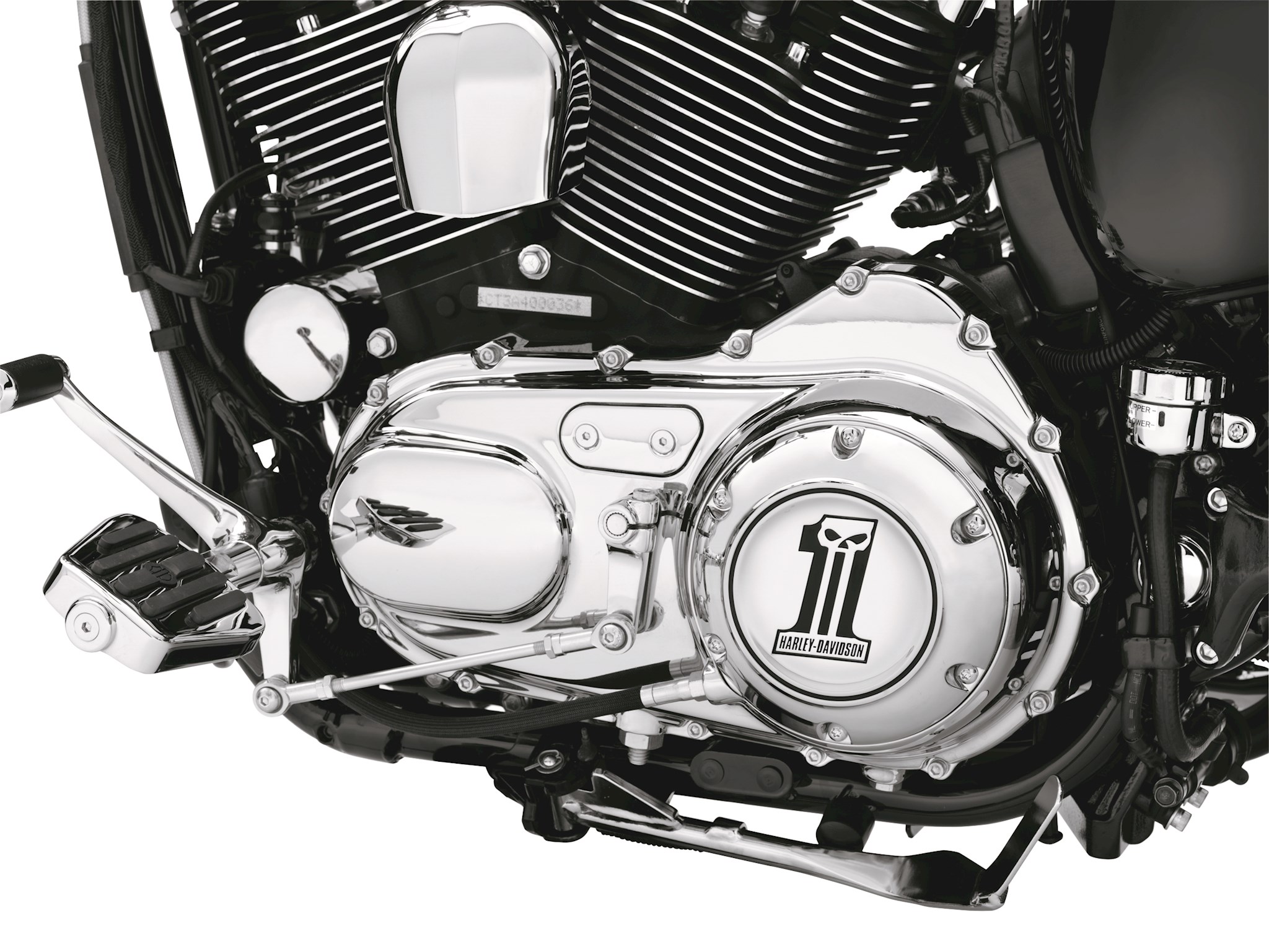 The sinister Harley-Davidson #1 Skull logo dresses for a night on the town. This complete die-cast aluminum collection has been polished and chrome-plated to a brilliant shine, then finished with a contrasting black-filled Dark Customâ„¢ Skull logo. The black-filled race track stripe and recessed hardware pockets provide added depth and dimension. Includes chrome-plated mounting hardware.