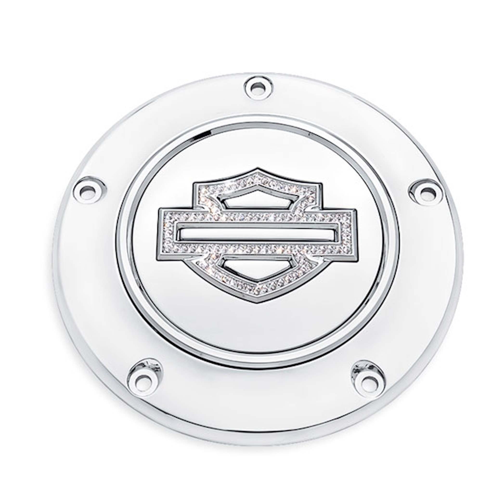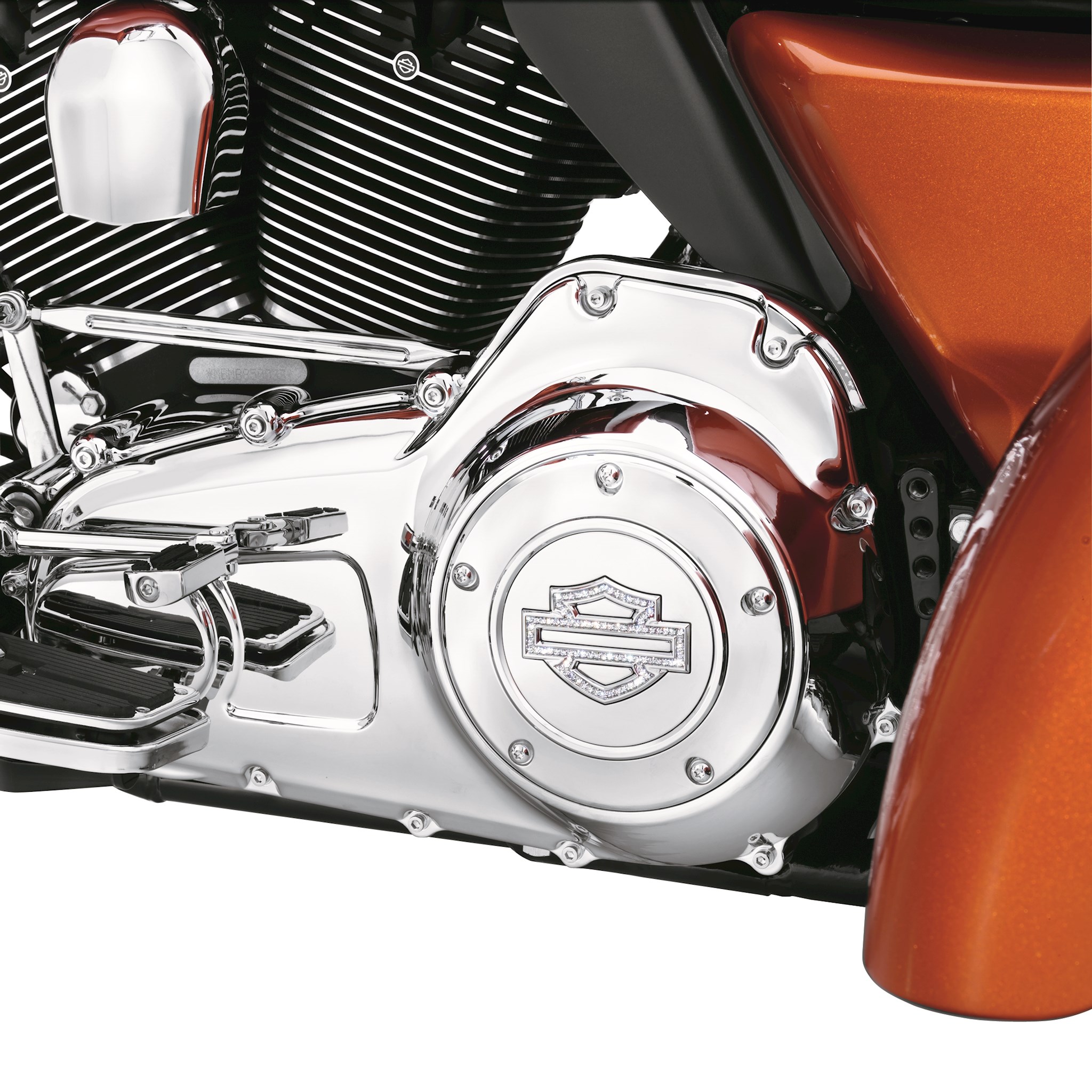 Add a touch of "bling" to your ride. Set against mirror-polished chrome, these crystal clear rhinestones add a brilliant flash, and dance in the direct sunlight. This complete line of engine trim is easy to install, and adds a bold and bright rhinestone-encrusted Bar & Shield logo to the profile of your bike. Kits include chrome-plated mounting hardware.