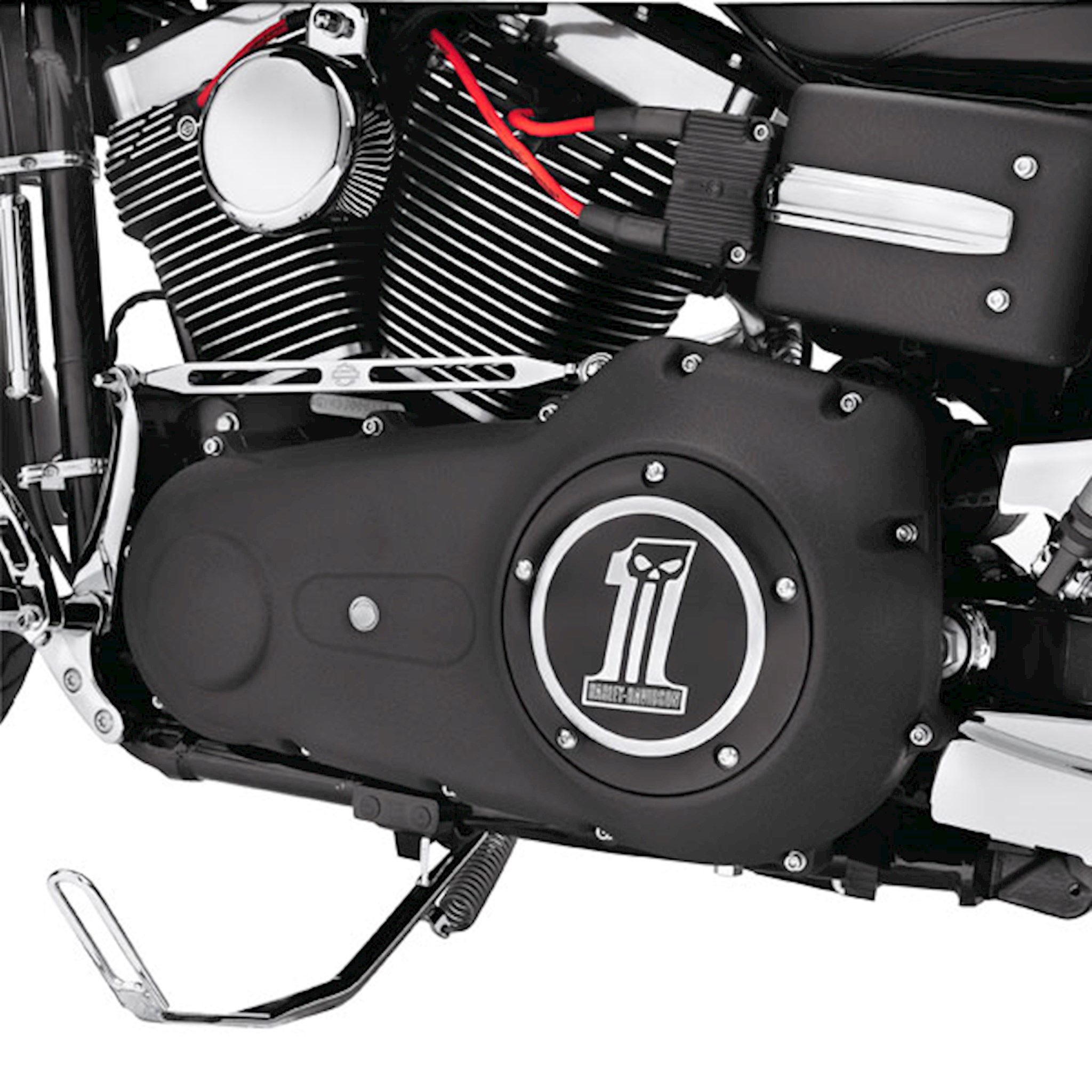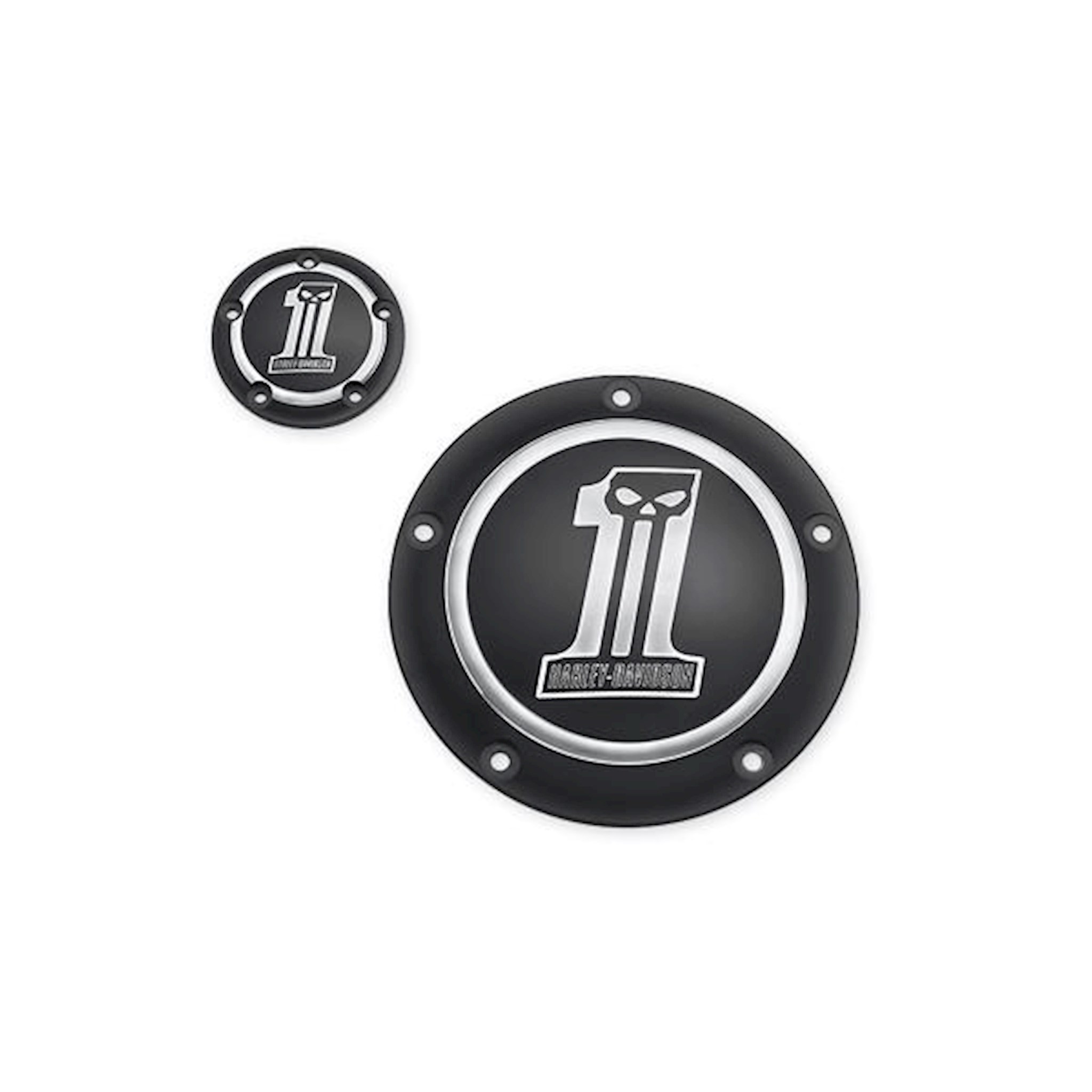 The famous Harley-Davidson #1 logo with a sinister twist. Machined from billet aluminum, these covers feature domed surfaces that are polished and black anodized to a rich satin sheen, and then re-machined to expose the raw aluminum. The resulting high-contrast design complements both polished and painted engine finishes.