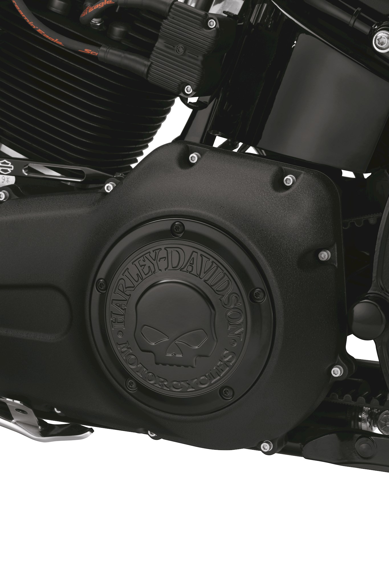 Penned at the hand of Willie G, the famous Skull Collection makes a shift to the dark side. Completely drenched in matte black, the raised skull and surrounding Harley-Davidson Motorcycle script adds a subtle ominous touch to your ride. The matte finish easily coexists alongside gloss black or wrinkle black surfaces. The complete collection of components includes matching black hardware.