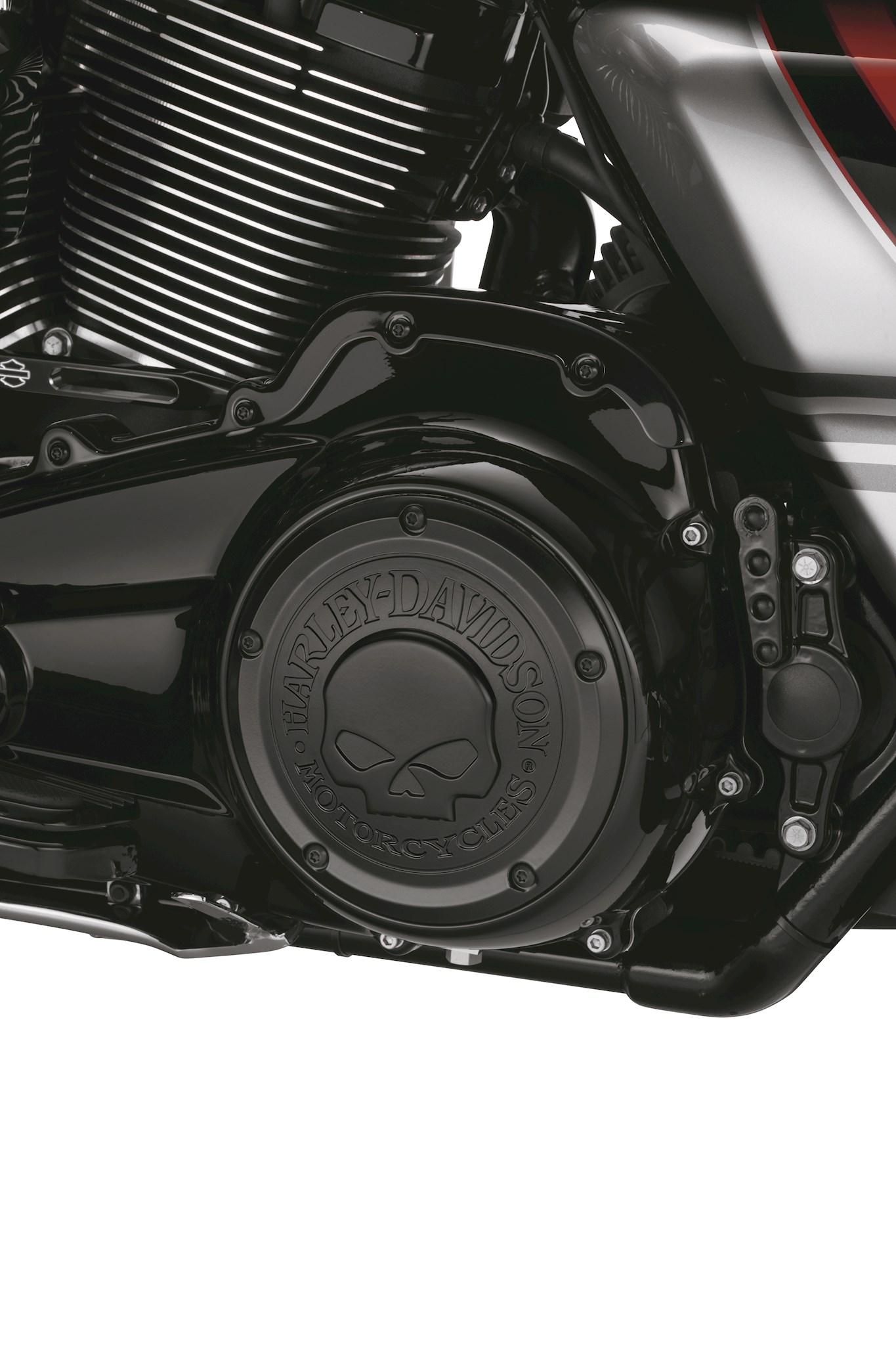 Penned at the hand of Willie G, the famous Skull Collection makes a shift to the dark side. Completely drenched in black, and styled to fit the new Accessory Softail Narrow-Profile Primary Covers the raised skull and surrounding Harley- Davidson Motorcycle script adds a subtle ominous touch to your ride. The finish easily coexists along side gloss black or wrinkle black surfaces.