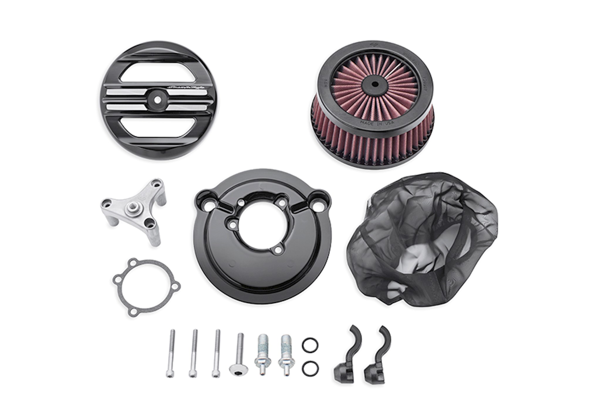 The look is bold and the performance exhilarating. This race-inspired air cleaner is engineered to flow through the perimeter and the face of the air filter, providing high volumes of unrestricted airflow to the engine. The open-design face plate features a rich black finish with machined longitudinal strakes to expose the glowing aluminum below. Kit includes air cleaner trim, one-piece cast back plate, high-flow washable air filter element, rain sock and all required hardware. All EFI-equipped models require ECM calibration* (priced separately).