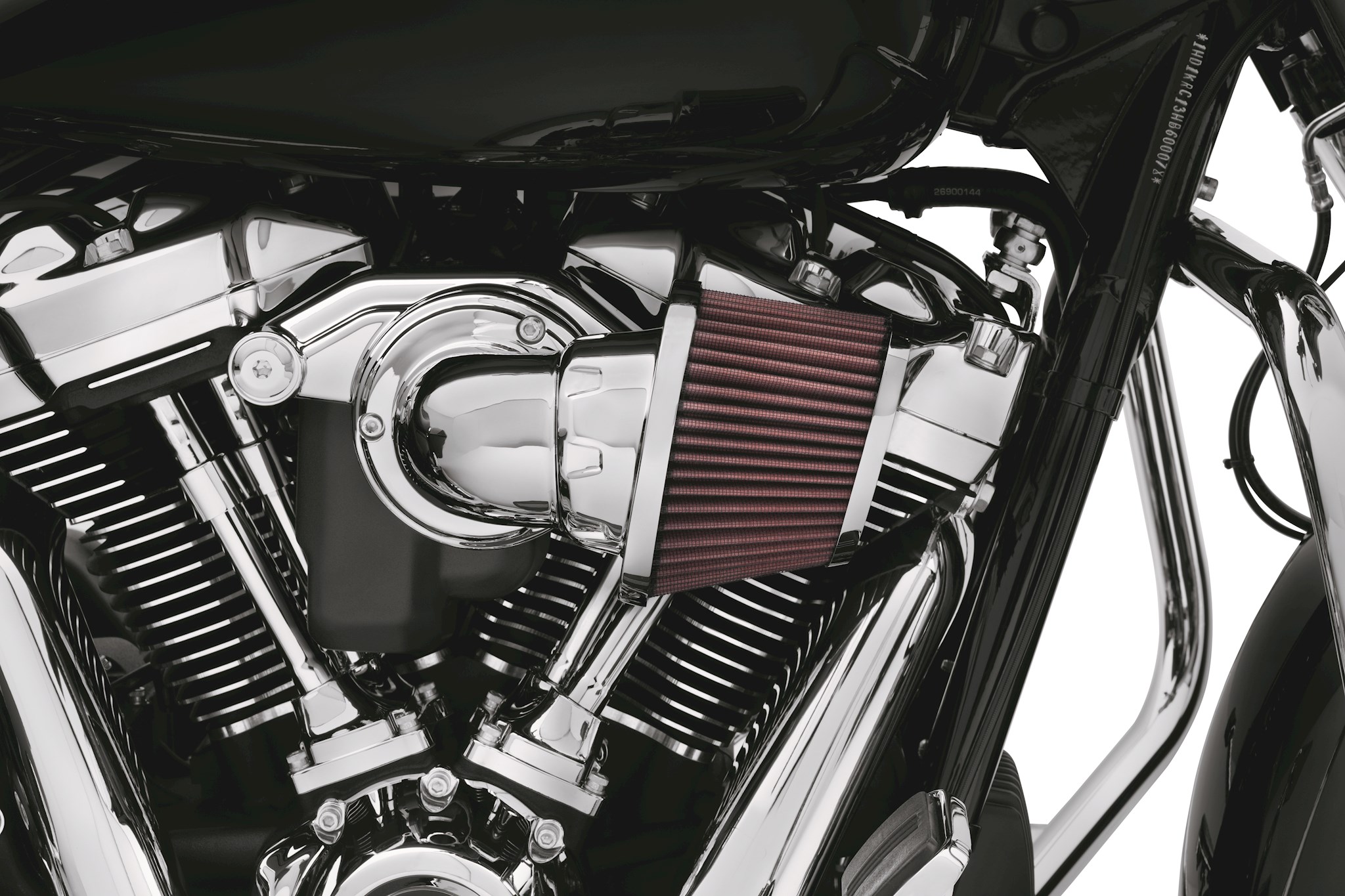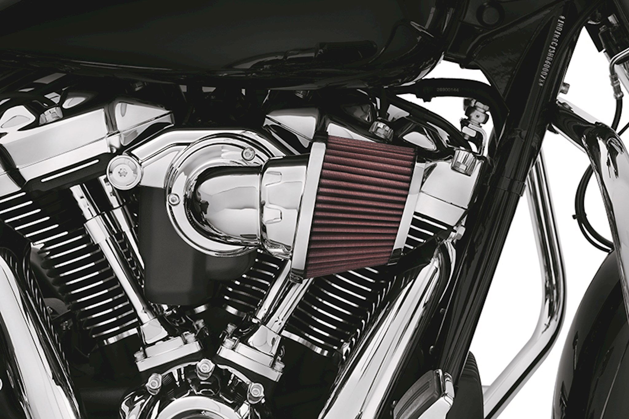 Take a deep breath. Designed in concert with the Milwaukee Eight powertrain, the iconic Heavy Breather Air Cleaner features a forward facing oiled cotton filter element that flows large volumes of clean air into the engine. The short, low-profile cast tube rams the charge directly into the throttle body with little turbulence for increased power and torque, and the intake tube mounts to a custom back plate that features integral breathers and covers the throttle body and electronics for a finished look. The slanted compact filter adds an aggressive performance look, and it is shaped to allow installation on Touring bikes equipped with fairing lowers. Available in your choice of chrome or gloss black finish, the kit includes filter, intake tube, custom back plate, water-repellent rain sock and all mounting hardware.