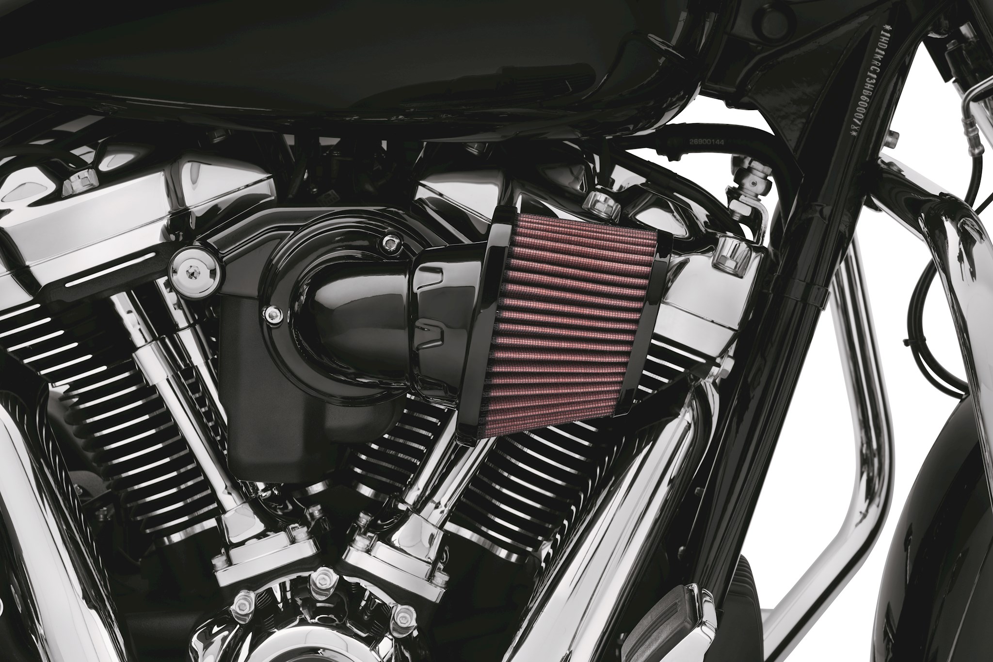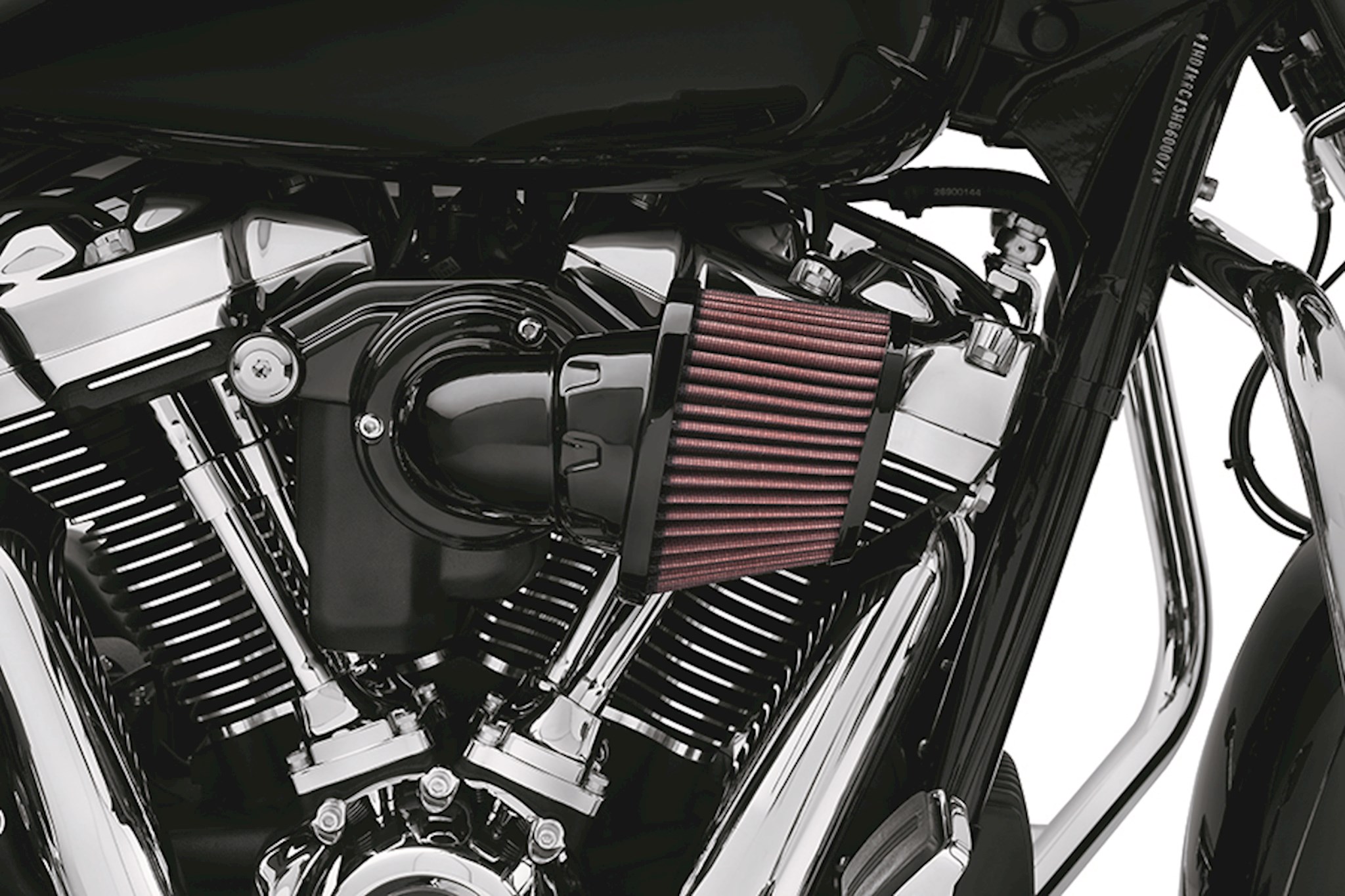 Take a deep breath. Designed in concert with the Milwaukee Eight powertrain, the iconic Heavy Breather Air Cleaner features a forward facing oiled cotton filter element that flows large volumes of clean air into the engine. The short, low-profile cast tube rams the charge directly into the throttle body with little turbulence for increased power and torque, and the intake tube mounts to a custom back plate that features integral breathers and covers the throttle body and electronics for a finished look. The slanted compact filter adds an aggressive performance look, and it is shaped to allow installation on Touring bikes equipped with fairing lowers. Available in your choice of chrome or gloss black finish, the kit includes filter, intake tube, custom back plate, water-repellent rain sock and all mounting hardware.