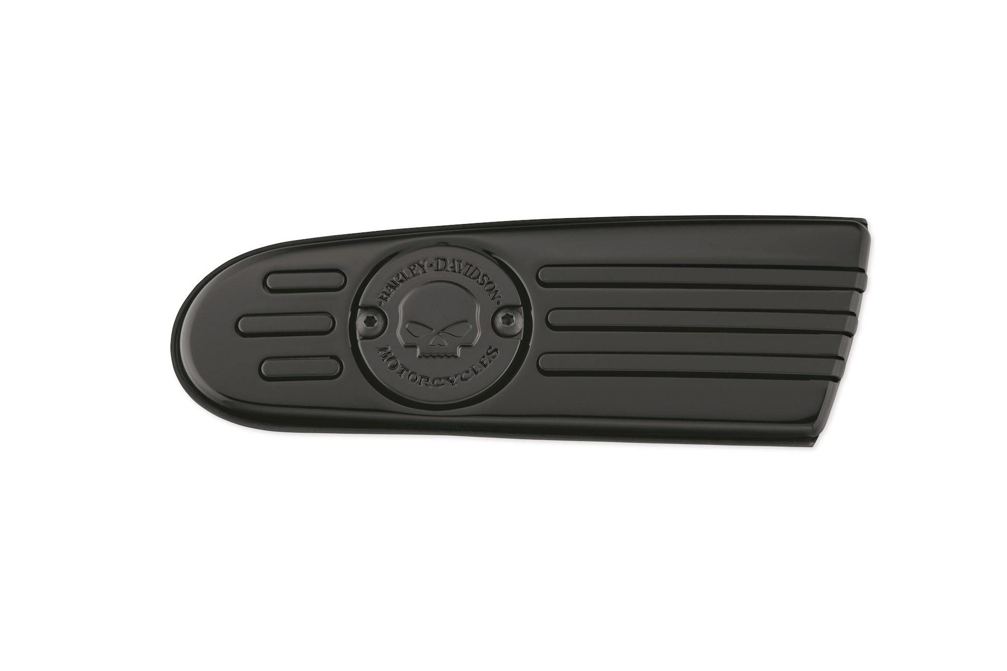Penned at the hand of Willie G, the famous Skull Collection makes a shift to the dark side. Completely drenched in matte black, the raised skull and surrounding Harley-Davidson Motorcycle script adds a subtle ominous touch to your ride. The matte finish easily coexists alongside gloss black or wrinkle black surfaces. The complete collection of components includes matching black hardware.