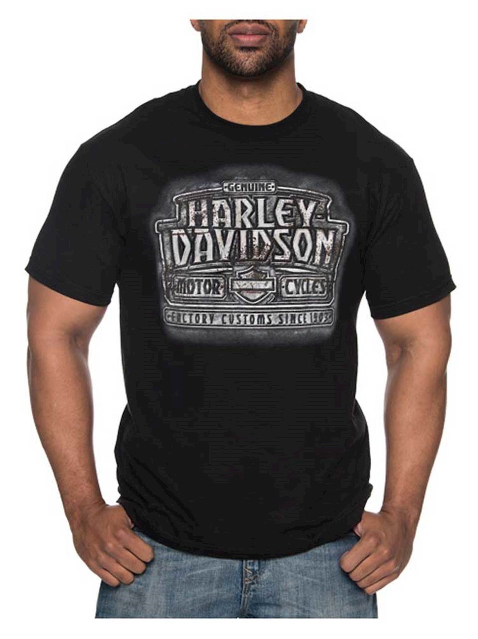 Harley-Davidson® Men's Rampart Short Sleeve T-Shirt - Solid Black, 30297426. Features a screen printed distressed Harley-Davidson® script graphic. Back features our Motor Saloon Harley-Davidson® Dealer logo. Classic style crew neck, traditional comfort fit. Soft and comfortable t-shirt, made from 100% cotton. Guys you can never have too many black t-shirts!