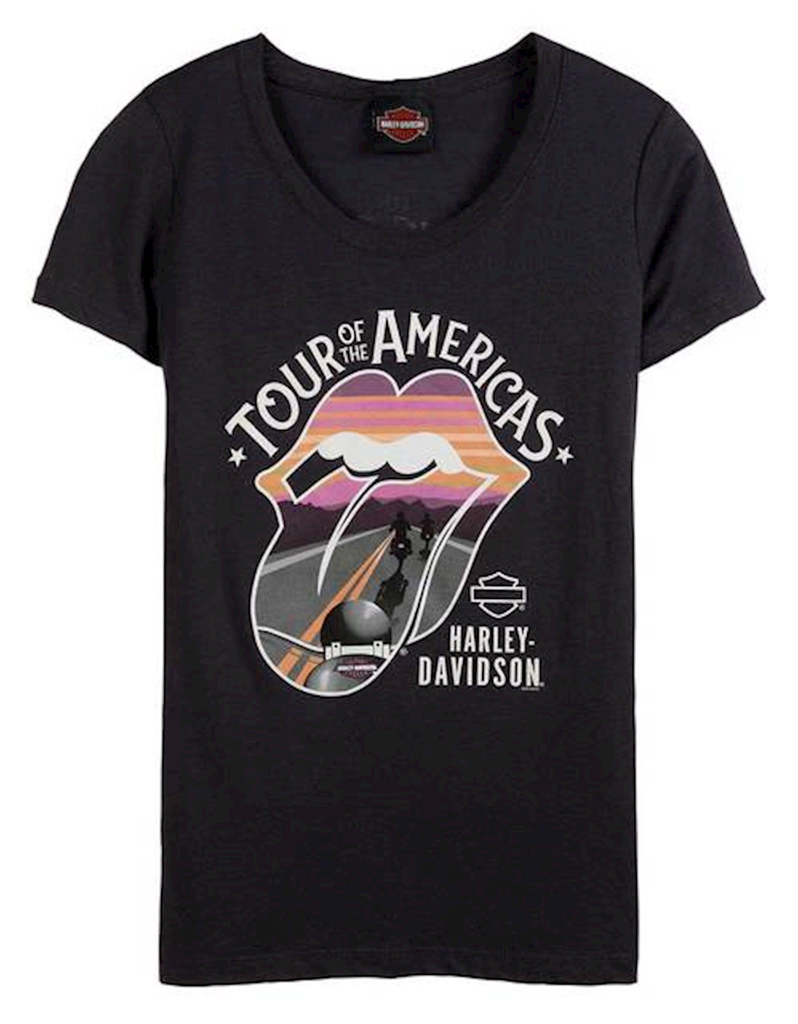 Harley-Davidson® Women's Rolling Stones America Tour Short Sleeve Tee, 30298870. If Rock N' Roll and Hogs are your thing, you are definitely going to dig this collection. Awesome mash-up of one of the most famous band in rock history and Harley-Davidson®. Awesome screen printed graphic the combines the iconic 'tongue & lips' logo with a biker graphic. Flip the tee over to see all of the cities the band went to on this epic Tour of the Americas. Extremely soft and lightweight, made of 50% polyester, 25% cotton and 25% rayon. Classic fit tee, attractive deep scoop neck. The Rolling Stones have teamed up with Harley-Davidson® to release this special limited edition collection. A collaboration that brings two iconic brands together!