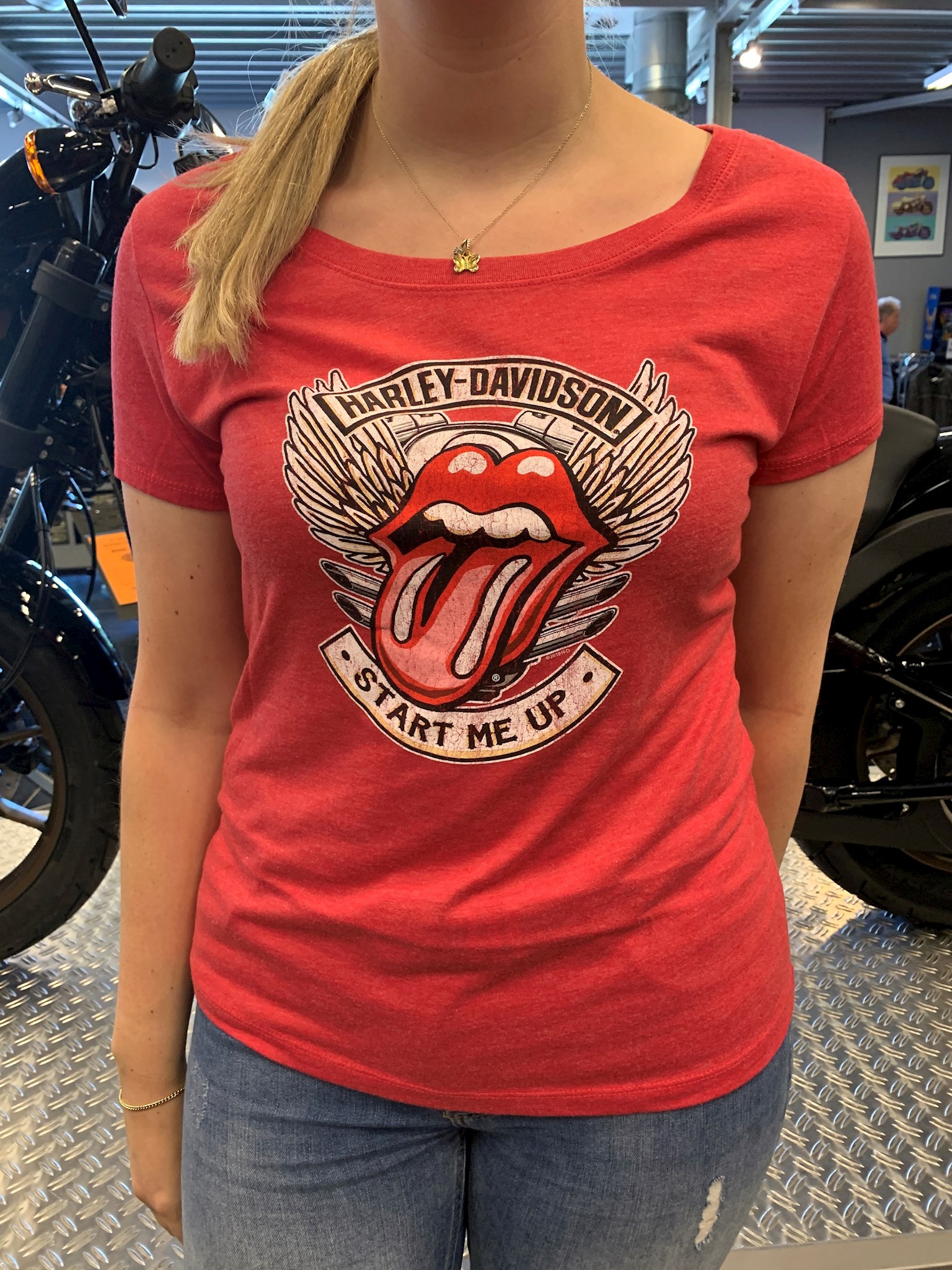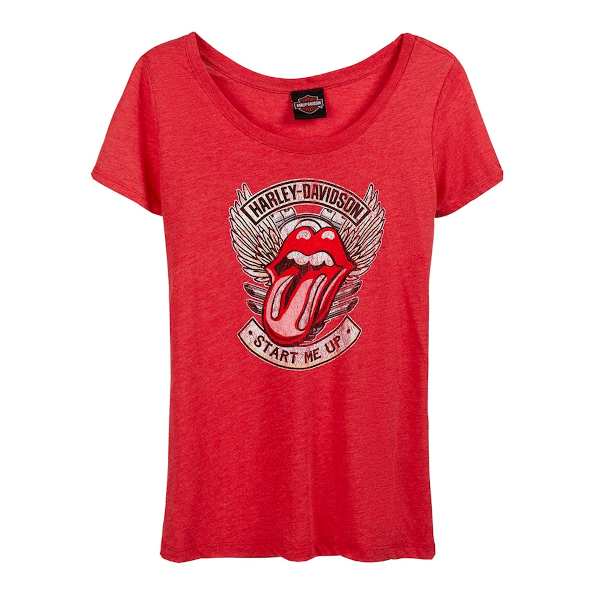 H-D® Rolling Stones Start Me Up Short Sleeve Tee. If Rock N' Roll and Hogs are your thing, you are definitely going to dig this collection. Awesome mash-up of the most famous logo in rock history, the iconic 'tongue & lips' and bold Harley-Davidson® text in the front and Warr's Harley-Davidson London UK in the back.. The distressed graphic is accented with The Rolling Stones famous song 'Start Me Up' and stunning winged design. Extremely soft and lightweight, made of 50% polyester, 25% cotton and 25% rayon. Classic fit tee, attractive deep scoop neck. The Rolling Stones have teamed up with Harley-Davidson® to release this special limited edition collection. A collaboration that brings two iconic brands together!