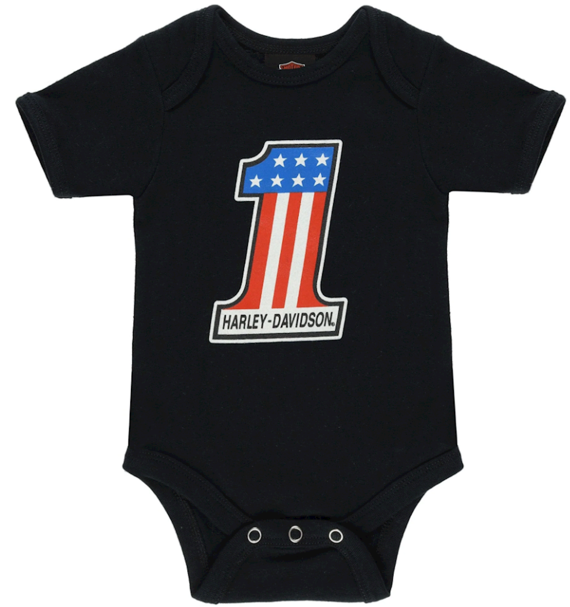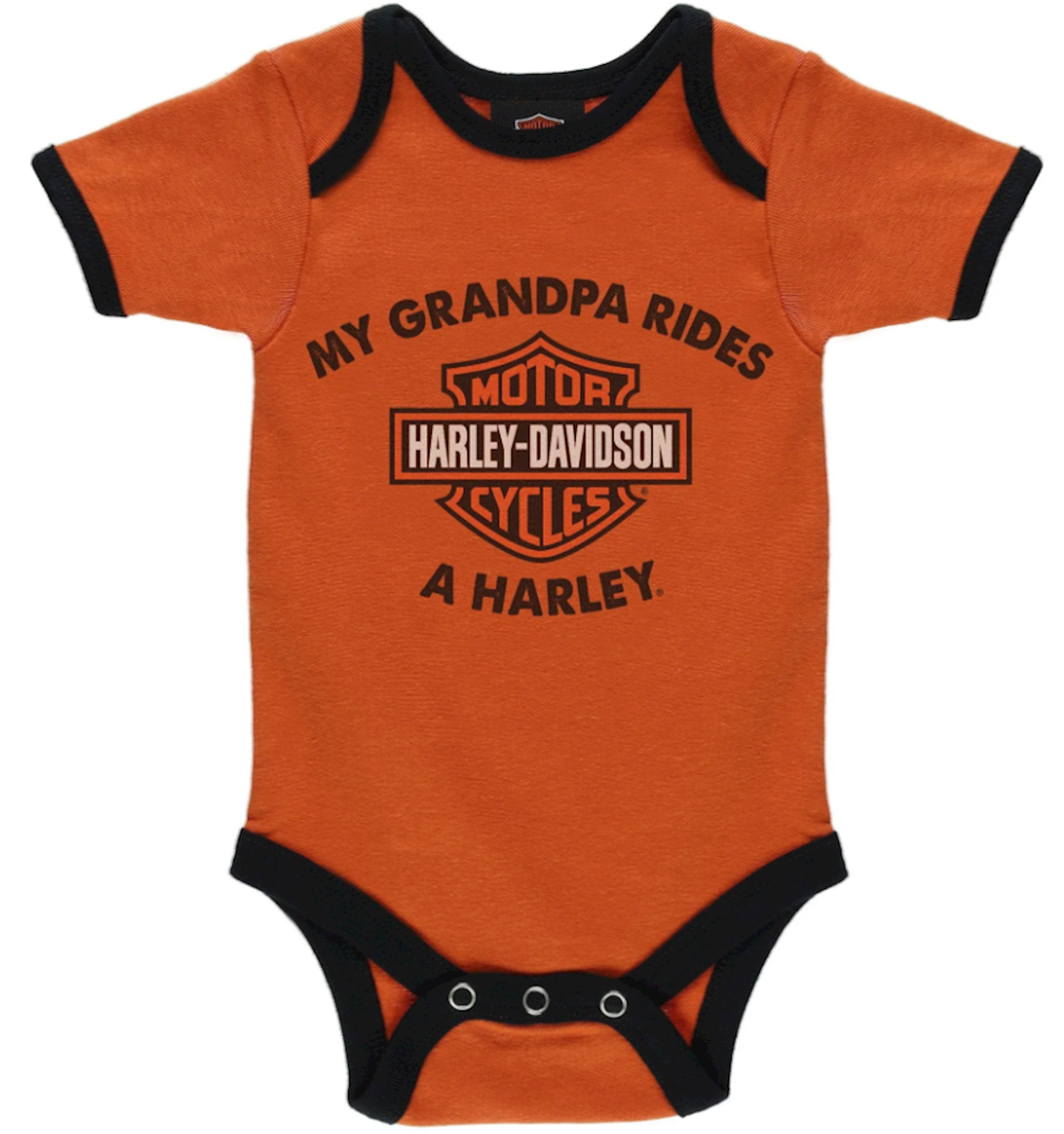 Soft and Comfortable, made from 100% cotton. Bold 'My Grandpa Rides a Harley' script. Iconic #1 RWB logo screen print. Three button snap closure at bottom. Black and Orange.