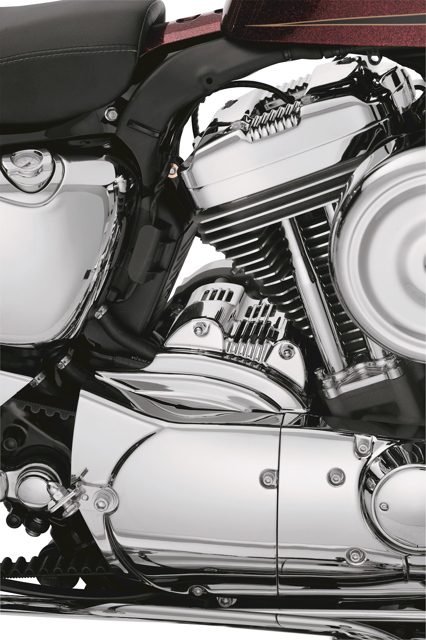Cover and conceal the starter motor and the area behind the rear cylinder with a splash of style. This shapely ribbed and slotted cover conceals the starter motor and starter solenoid for a clean, custom look. Kit includes all required mounting hardware. Fits '04-later XL models.