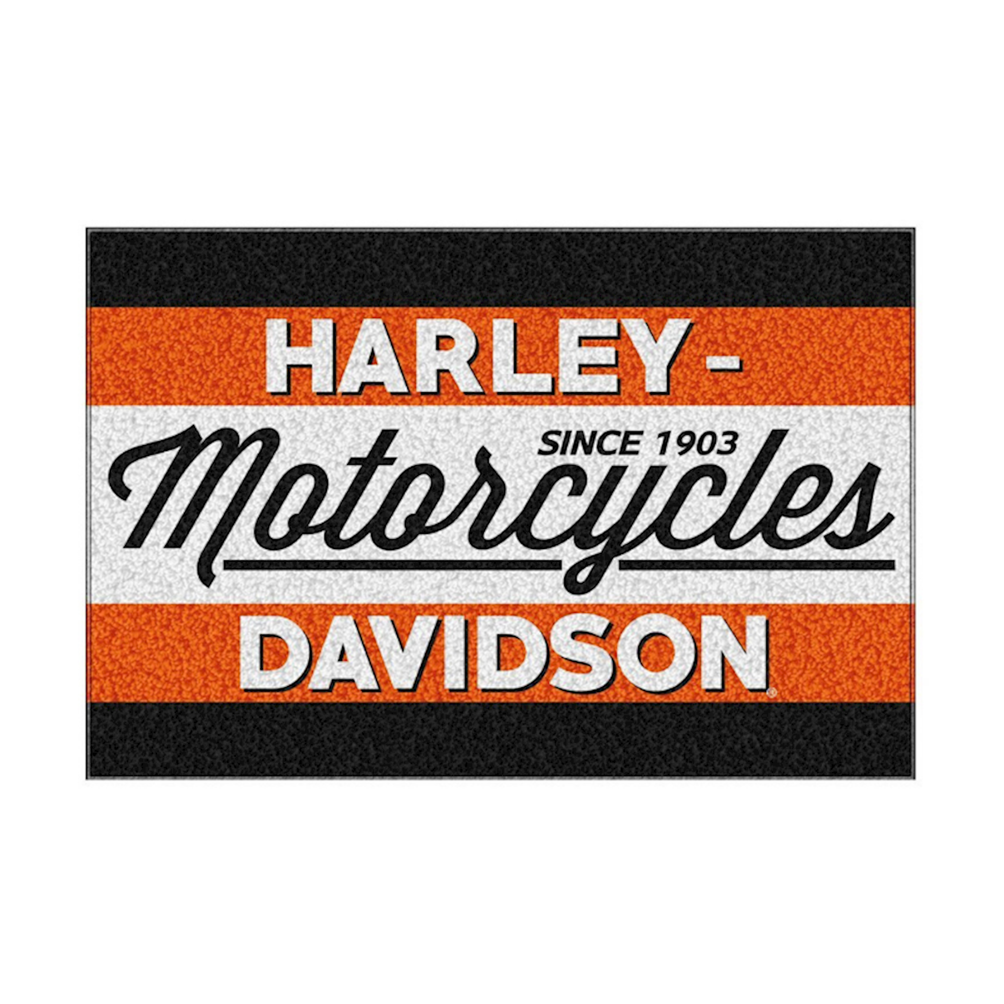 Harley-Davidson® Racetag Large Tufted Rug. Size: 39" x 59". Features an awesome racing inspired Harley-Davidson® script graphic. Tough and attractive. Made of 100% Nylon. Has a non skid backing to keep the rug from moving when stepped on. This rug would be great in an entryway or garage.