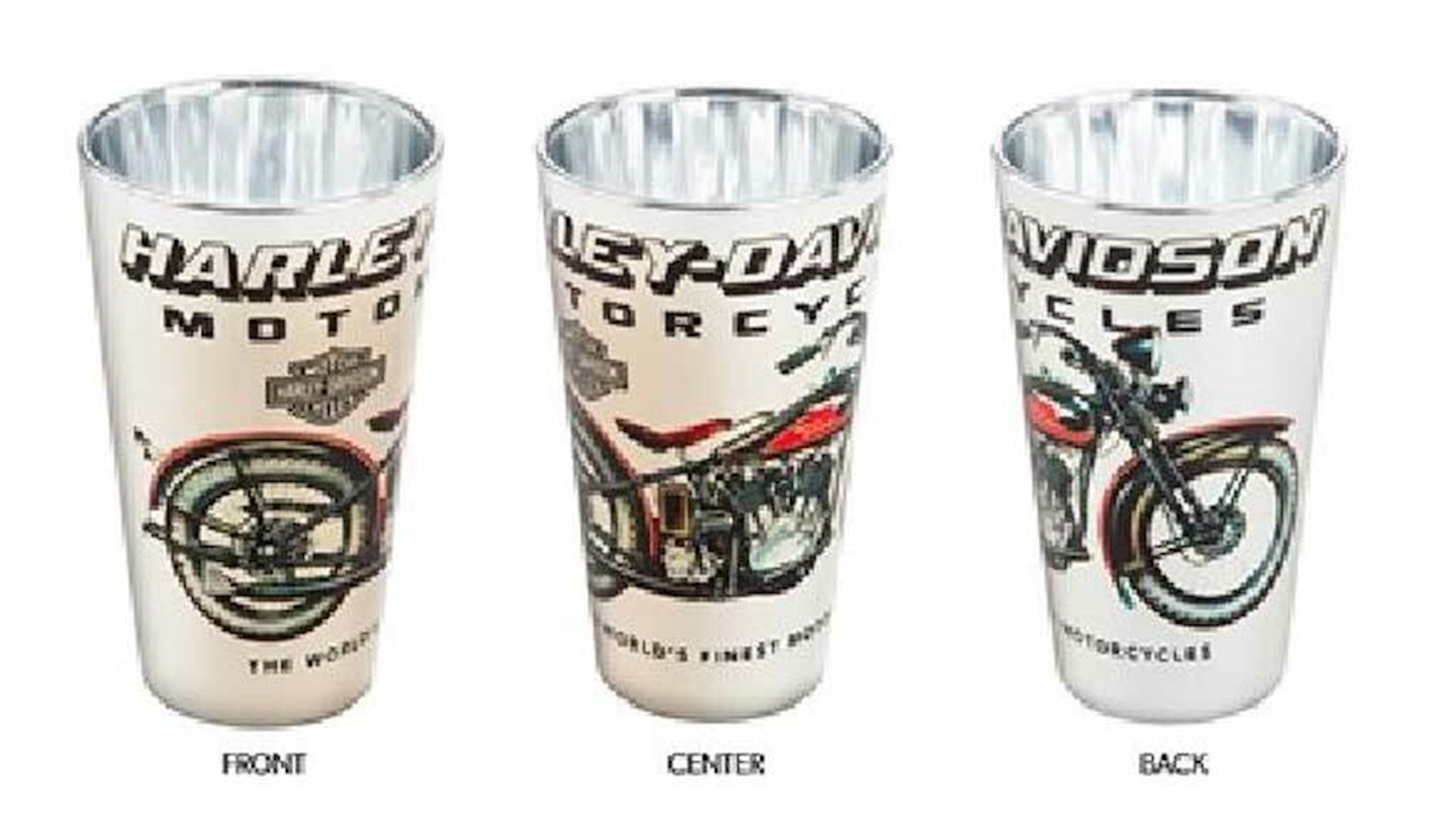 Harley-Davidson® Vintage Motorcycle Pint Glass - Shiny Silver, 3PT4900EP. New 16 oz. pint glass raises the bar for drinkware. Durable and light weight. Sleek shiny and glossy silver glass with an awesome screen printed vintage motorcycle graphic. The perfect addition to your home bar.