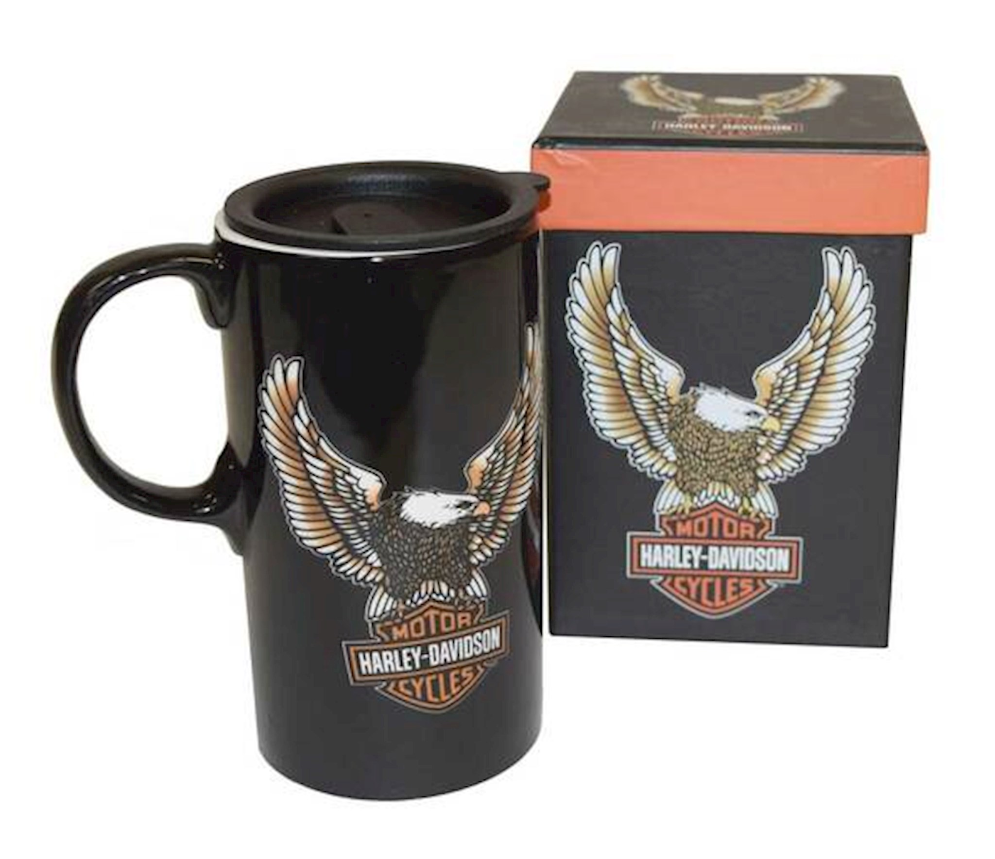 Harley-Davidson® Eagle Bar & Shield® Tall Boy Travel Mug, 3TBT4907, keeps your beverage hot or cold. Glazed to a coal-black mirror finish, the mug’s Eagle Bar & Shield® logo is fired into the finish for life. Whether you're off on vacation or just off to work, the Tall Boy Travel cup will always be ready, keeping your hot drinks hot and your cold drinks cold. These mugs have a spill-proof plastic lid with silicone ring for a perfect seal. They make great gifts for family and friends! The mugs are sized so that they will also fit into most automobile cup holders. The mug holds over 20-ounces of your favorite brew. Made to be dishwasher and microwave safe. The mug comes packaged in an attractive Eagle Logo gift box, sized 5.25'' W x 3.5'' x 6.25'' H. Manufacturer Part Number, 3TBT4907.