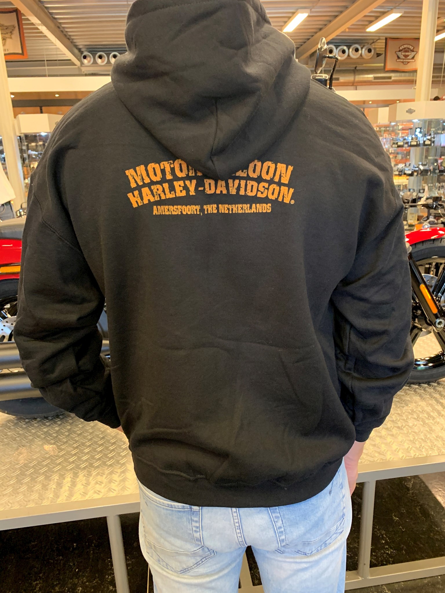 Polyester-blend. Soft and comfortable hoodie, made from a polyester blend. Kangaroo style pocket and a drawstring hood. Harley-Davidson Bar & Shield on front. Dealer imprint on back.