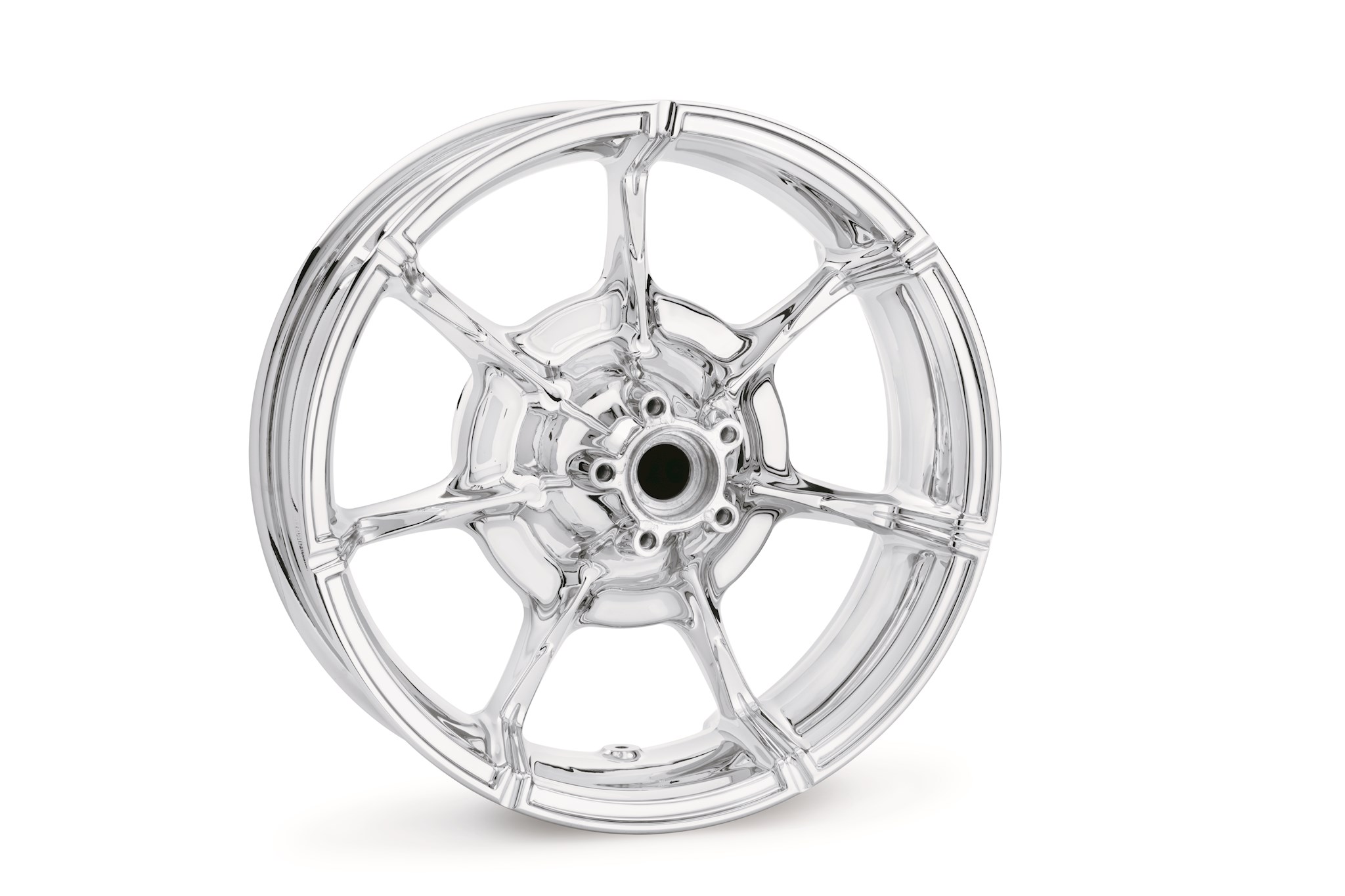 Cut to the bone. The seven minimalist spokes radiate from the center hub and grasp the rim with an iron fist. The mirror-chrome finish and the faceted spokes collect the light and throw it back in a brilliant display. Tested to H-D's high standards for durability and finish, this wheel will give you years of trouble-free miles. Requires separate purchase of model-specific Wheel Installation Kit, Sprocket hardware and Brake Rotor-specific hardware. See I-sheet for details. Installation may require separate purchase of wheel size and model-specific tire.