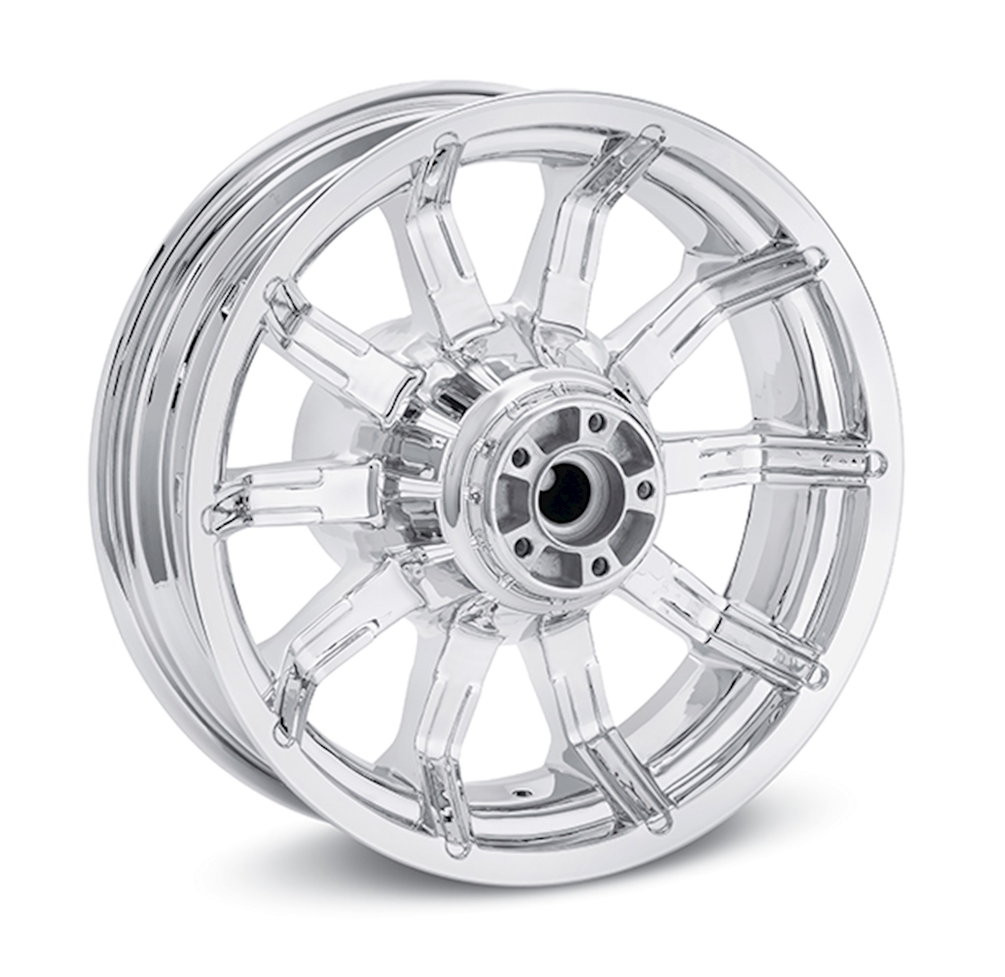 Shift into a higher gear. Add a custom touch of chrome without changing the distinctive style of your Touring motorcycle. These custom finished versions of the 10-spoke Original Equipment cast aluminum wheels are the perfect marriage of tough and mechanical with stunning and dazzling. Available in a 100% polished brilliant mirror chrome finish, these wheels have undergone hundreds of hours of real-world testing to meet the highest standards of performance and durability. Requires separate purchase of model-specific Wheel Installation Kit, Sprocket hardware and Brake Rotor-specific hardware. See I-sheet for details. Installation may require separate purchase of wheel size and
