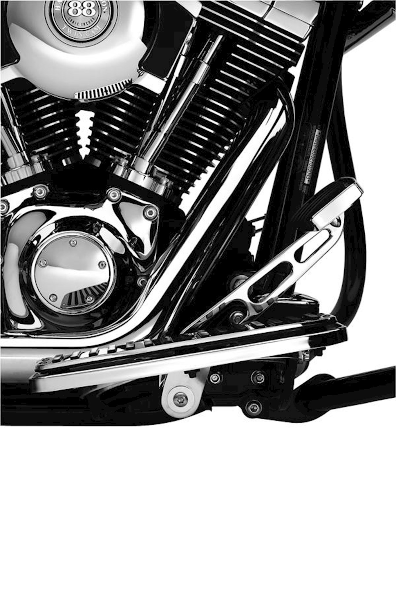 Styled to complement our billet style mirror stems and shift levers, these Billet Style Rear Brake Levers are forged from billet aluminum, then machined and polished for a beautiful, custom look. Available in your choice of mirror chrome, satin black powder coat or edge cut black anodized and machined aluminum finishes. Lever matches the length of the Original Equipment extended length lever found on late-model FL Softail motorcycles. Brake pedal pads sold separately. Fits '00-later FL Softail models. Will not fit with Rear Master Cylinder Cover P/N 41815-00.