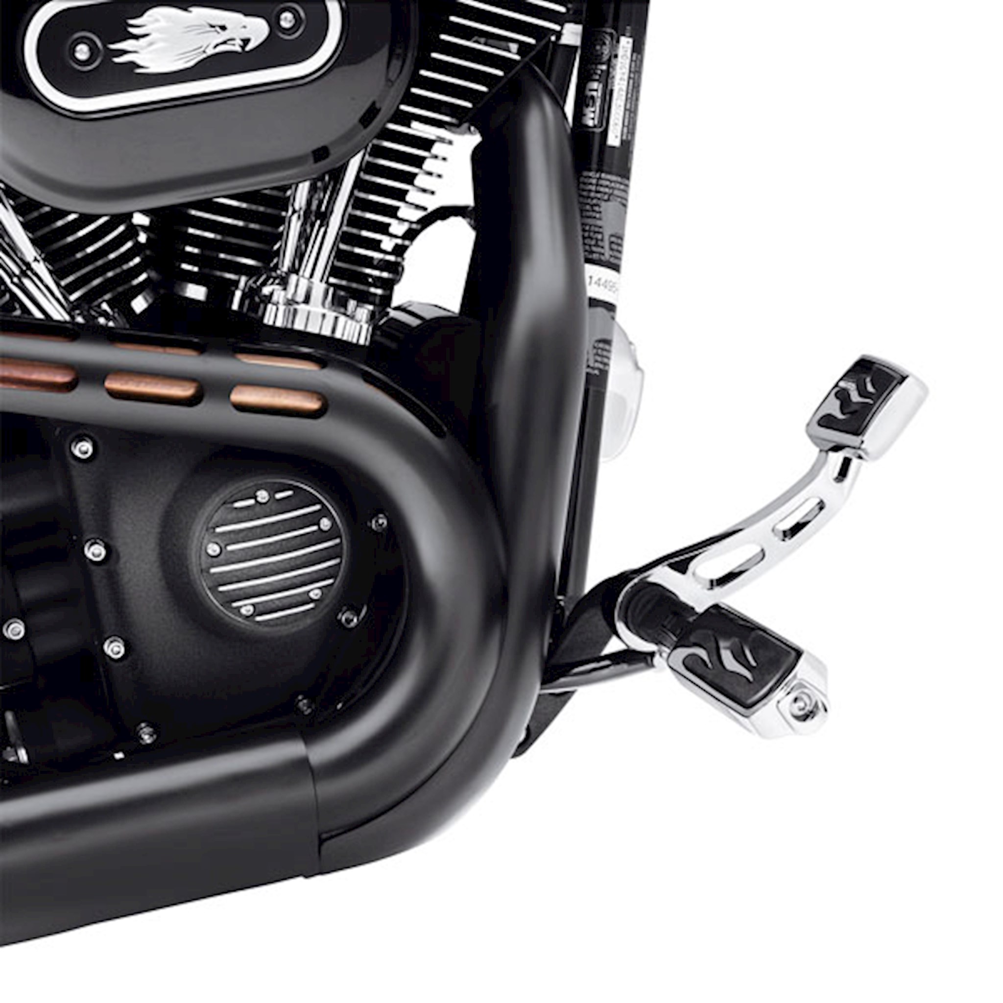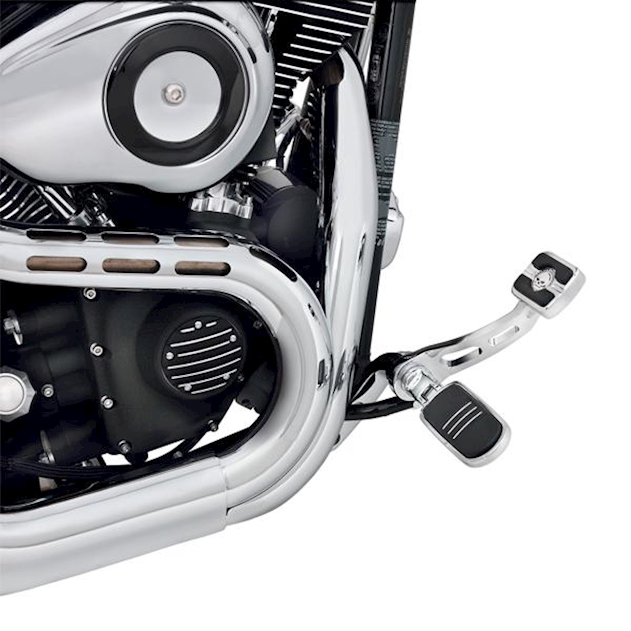 Styled to complement our billet style mirror stems and hand and foot controls, these slotted Rear Brake Levers are forged from 2014-T6 aluminum, then machined and polished for a beautiful, custom look. Available in your choice of mirror chrome, satin black powder coat or edge cut black anodized and machined aluminum finishes. Brake Pedal Pads sold separately. Fits '03-later Dyna® models equipped with forward controls.