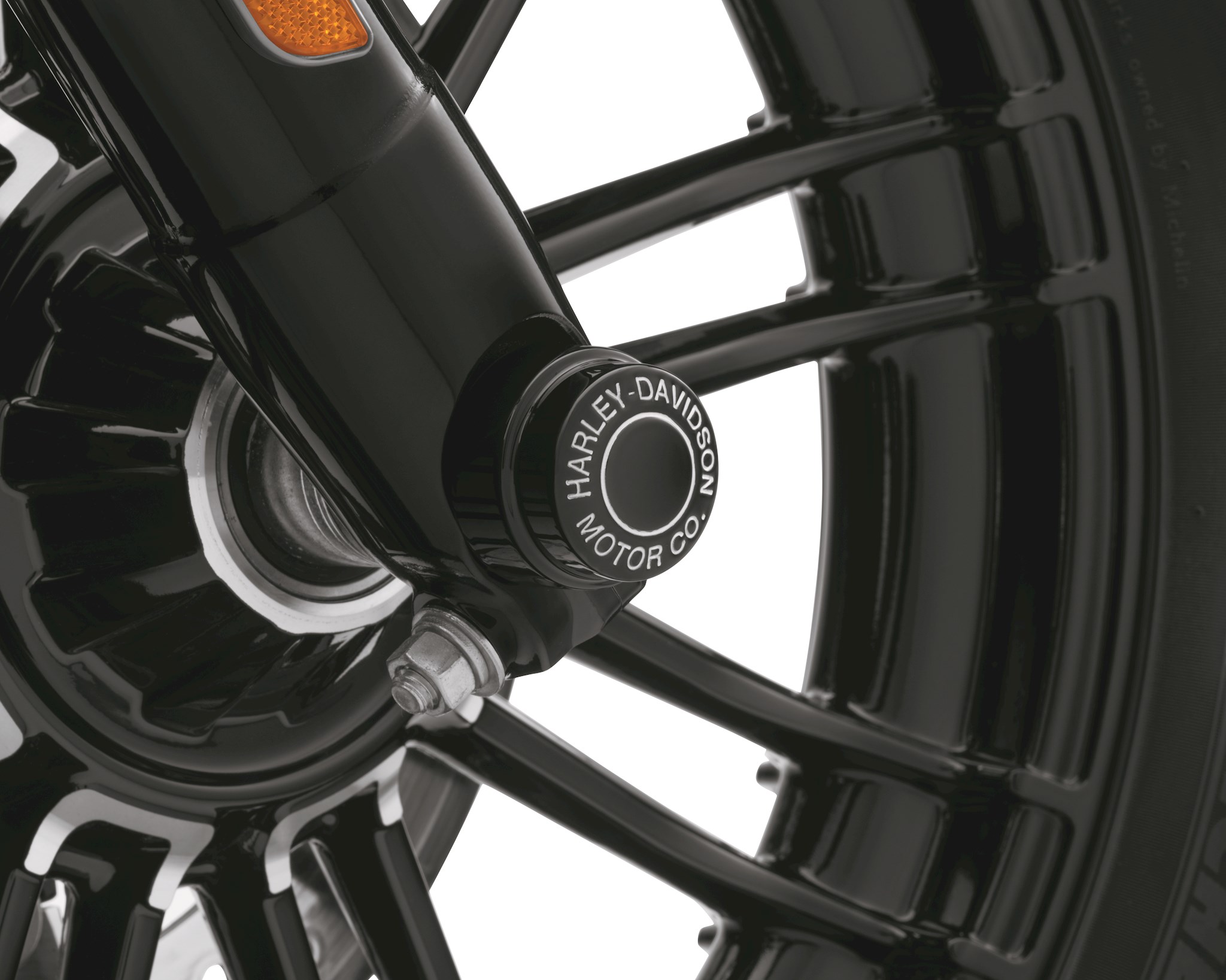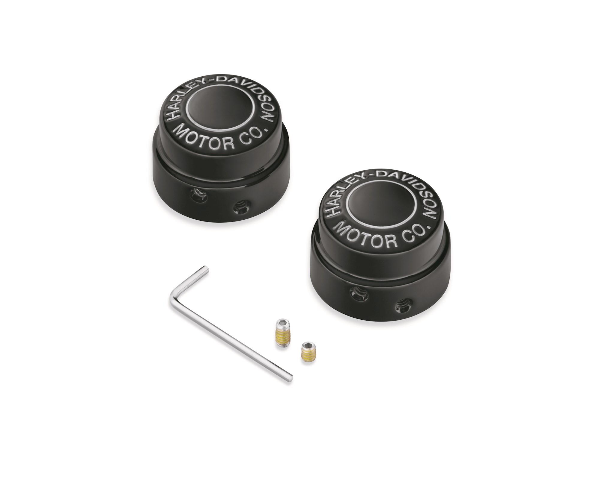 Cover the front axle in style. Drenched in gloss black and trimmed with deep cut, silver-filled Harley-Davidson Motor Co. lettering, these Axle Nut Covers are an aggressive twist on a classic style. The covers look great with Original Equipment satin-finish fork sliders or are the perfect finishing touch to complete a blacked-out front or rear end. These easy to install kits include all necessary mounting hardware. Sold in pairs.