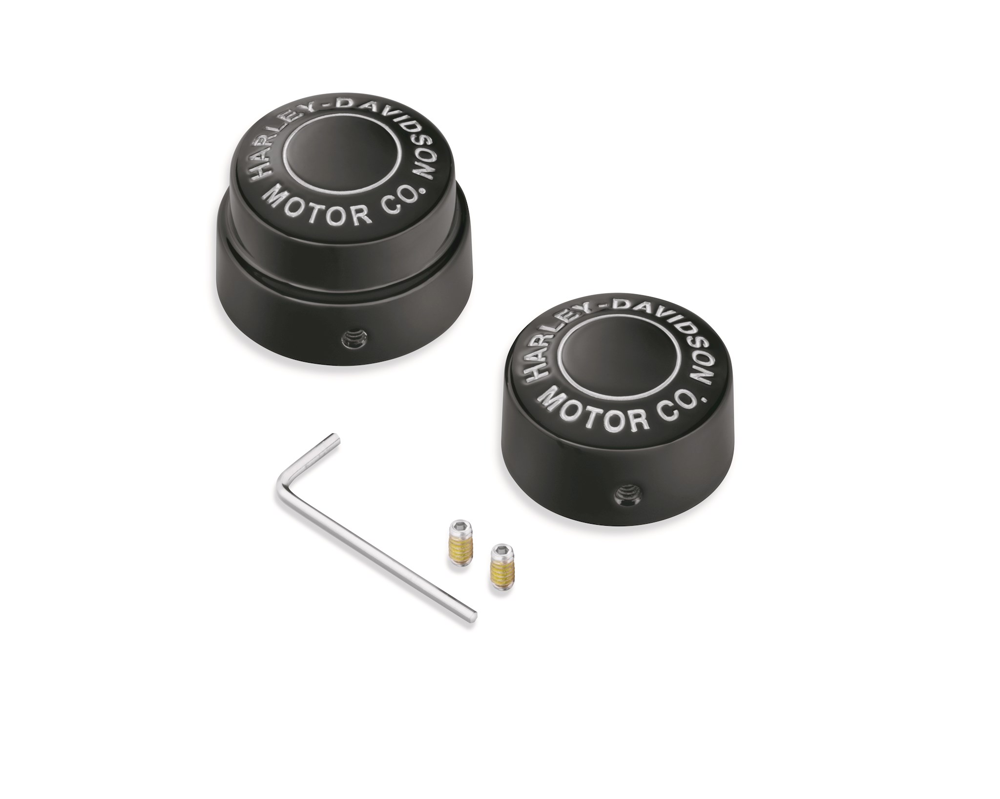 Cover the front axle in style. Drenched in gloss black and trimmed with deep cut, silver-filled Harley-Davidson Motor Co. lettering, these Axle Nut Covers are an aggressive twist on a classic style. The covers look great with Original Equipment satin-finish fork sliders or are the perfect finishing touch to complete a blacked-out front or rear end. These easy to install kits include all necessary mounting hardware. Sold in pairs.