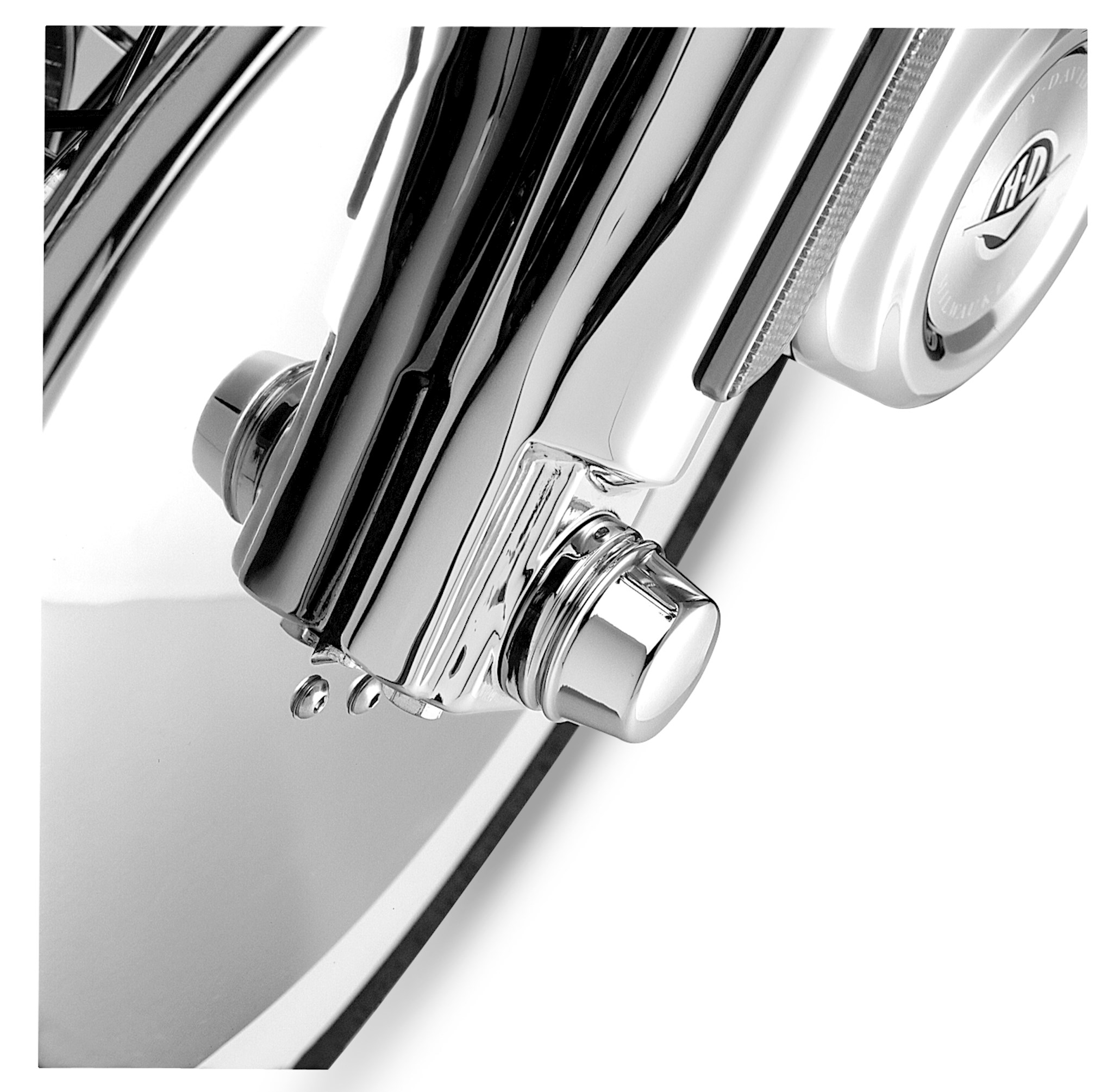 Thanks to an exclusive contoured profile, these unique chrome die-cast Front Axle Nut Covers appear smaller than others when installed. Sold in pairs.