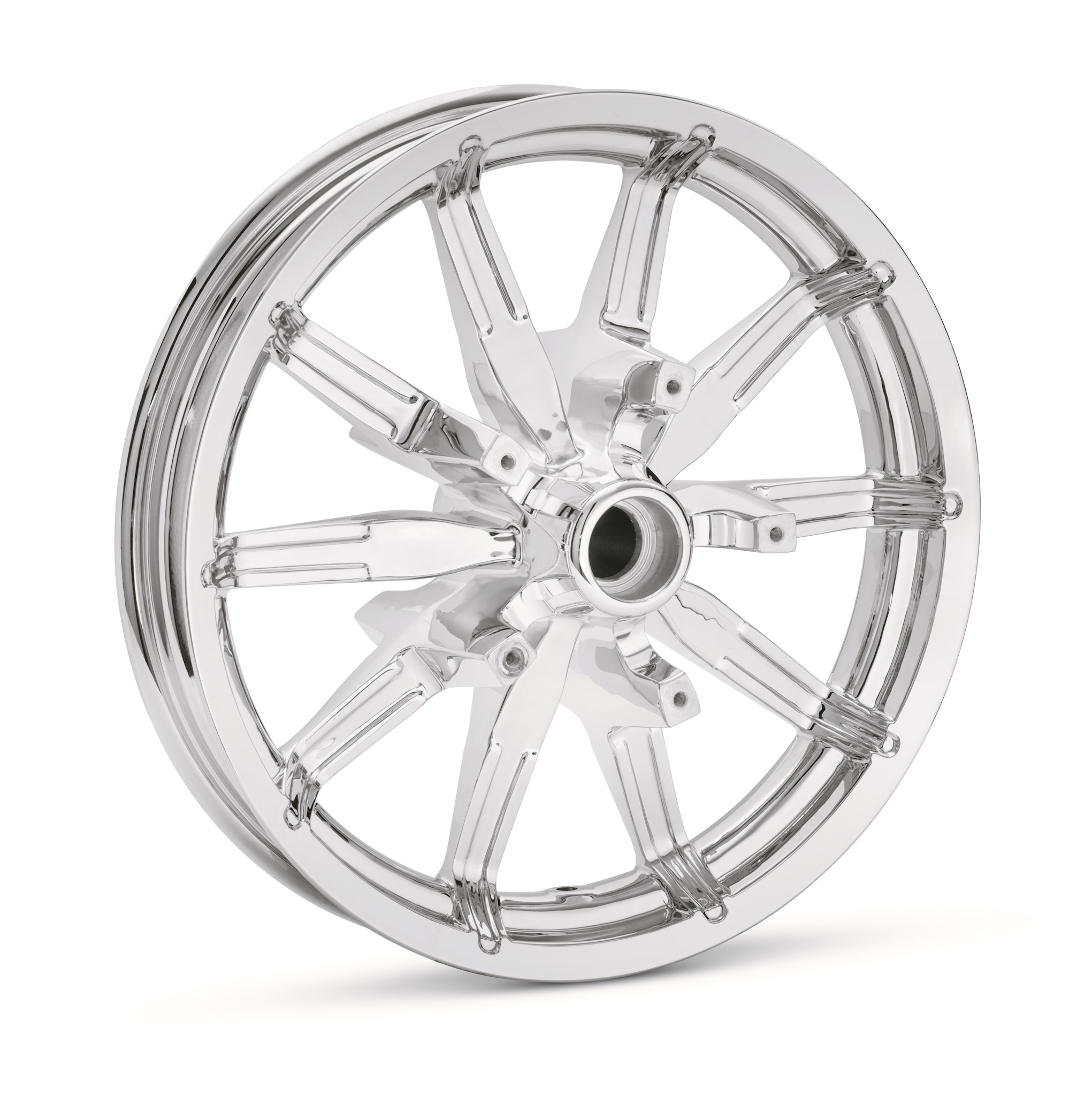 Shift into a higher gear. Add a custom touch of chrome without changing the distinctive style of your Touring motorcycle. These custom finished versions of the 10-spoke Original Equipment cast aluminum wheels are the perfect marriage of tough and mechanical with stunning and dazzling. Available in a 100% polished brilliant mirror chrome finish, these wheels have undergone hundreds of hours of real-world testing to meet the highest standards of performance and durability. Requires separate purchase of model-specific Wheel Installation Kit, Sprocket hardware and Brake Rotor-specific hardware. See I-sheet for details. Installation may require separate purchase of wheel size and model-specific tire.