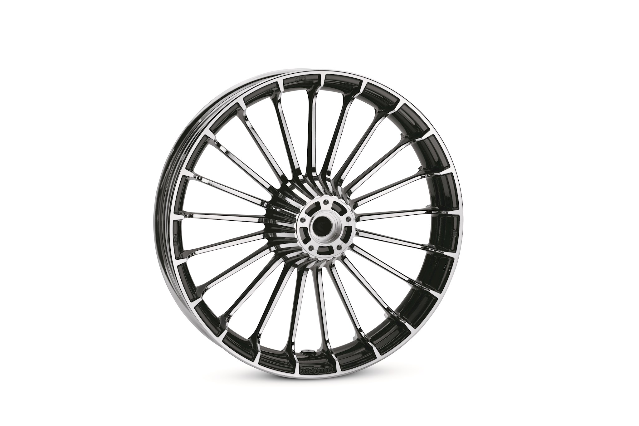 Bring the gleam and add some edge. These cast aluminum "Turbine"-style wheels feature 21 spokes which extend all the way to the edge of the rim, creating the illusion of a larger wheel diameter. The visually stunning wheels are meticulously polished and chrome plated for maximum reflective effect. All Genuine Motor Accessory wheels have been certified by Harley-Davidson to perform to our tough vehicle standards for quality and durability. Requires separate purchase of model-specific Wheel Installation Kit, Sprocket hardware and Brake Rotor-specific hardware. See I-sheet for details. Installation may require purchase of wheel size model-specific tire.