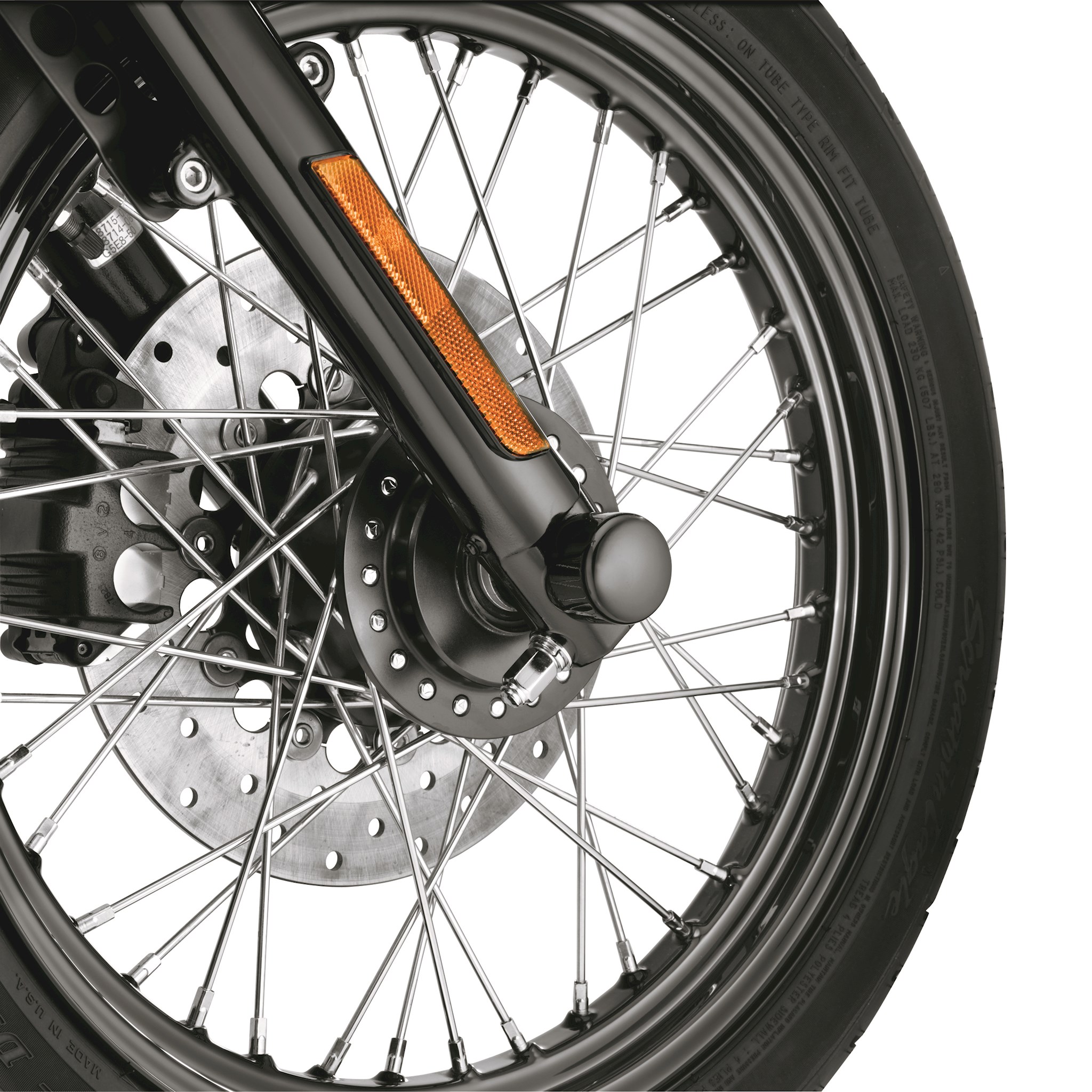 Cover the front axle in style. Available in chrome or gloss black finish, custom Axle Nut Covers look great with Original Equipment satin-finish fork sliders or add the finishing touch to a complete chrome or blacked-out front end. These Axle Cover Kits are easy to install and include all necessary mounting hardware. Sold in pairs. Fits '02-'11 VRSC™ (except VRSCF, VRSCR and '12-later VRSCDX), '15-later XG, '08-later XL, '08-later Dyna®, '07-later Softail® (except Springer™, FXCW, FXCWC, FLSTNSE, FXSBSE, FXST- Aus and FXSTD) and '08-later Touring and Trike models.