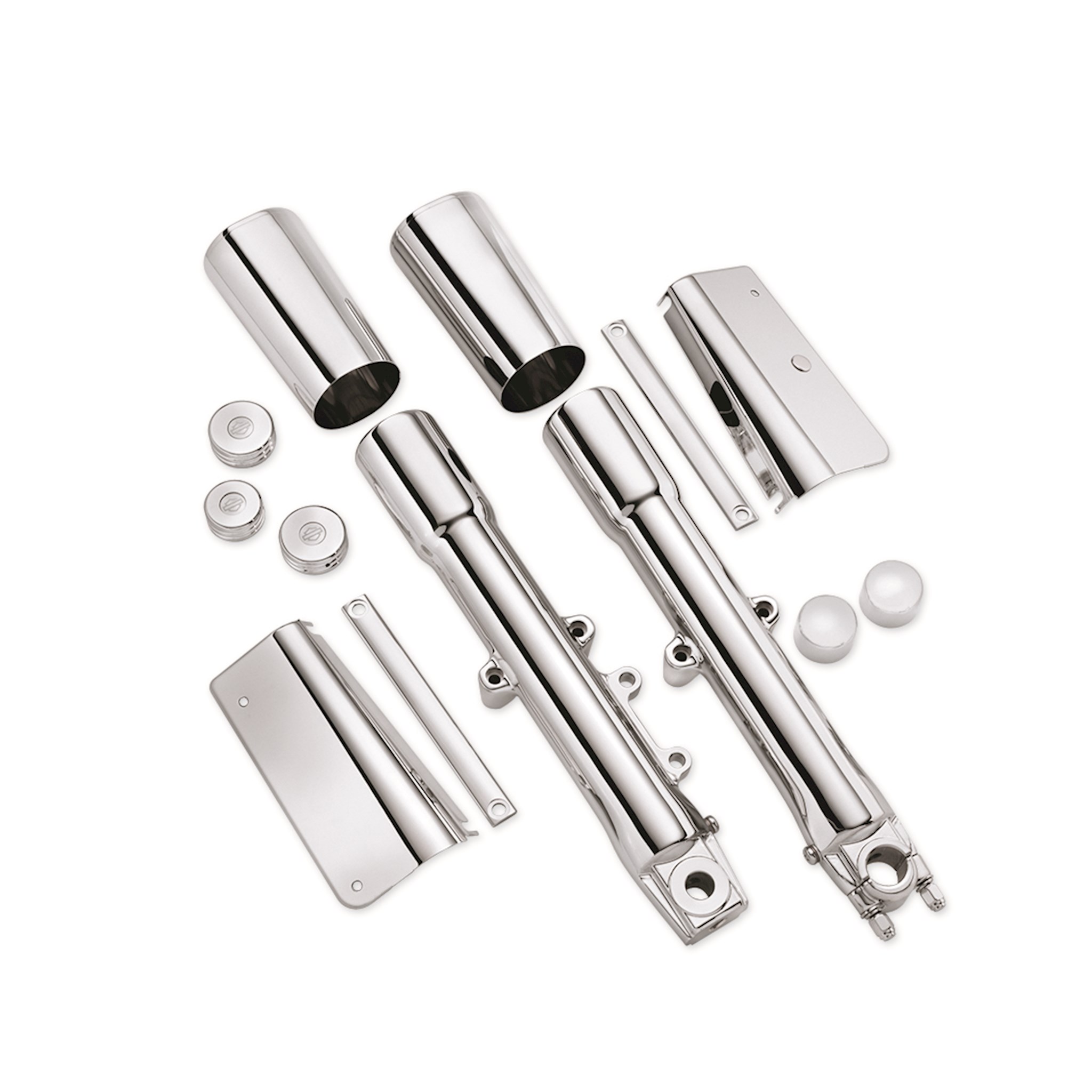 The front forks on a Harley-Davidson® motorcycle set the tone for the bike and can lead the way to a full-bore custom statement. So start customizing by adding chrome where it will have the most noticeable impact on the overall look of the bike, your front end. A perfect addition during the installation of Premium Ride or Profile® Low Front suspension components, this kit includes components necessary to completely chrome the front forks and includes some or all of the following (Kit components vary depending on your model): Chrome Fork Sliders, Oil Seals, Chrome Fork Axle Retainer Nut Kit, Chrome Fork Slider Drain Screw Kit, Classic Chrome Front Axle Nut Cover Kit and Chrome Upper Fork Nut Covers. Chrome Front End Package price does not include labor or supplies.
