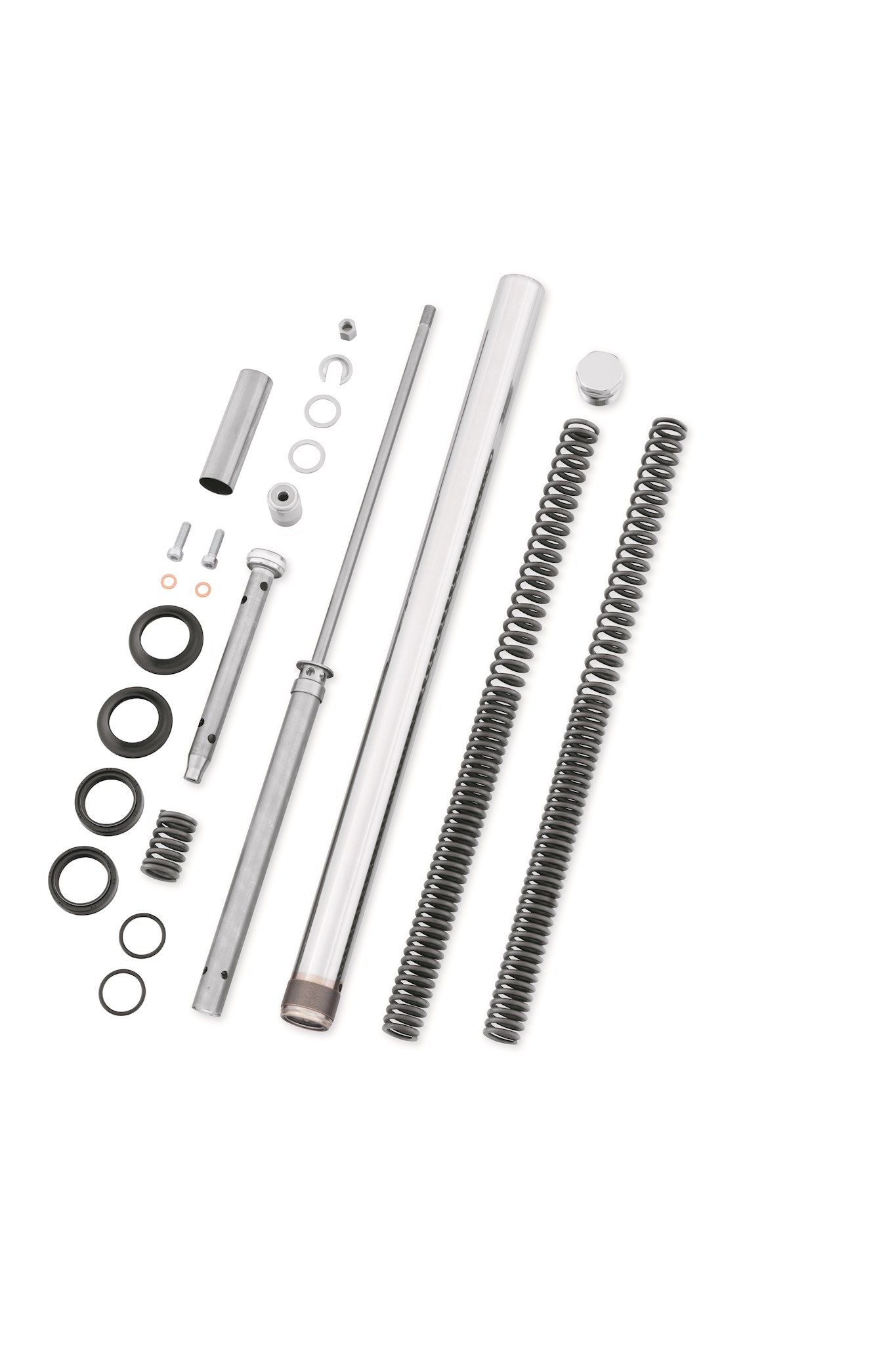 This Single Sided Cartridge Fork provides improved handling performance by keeping the tire in contact with the road surface. Tuned to work in concert with the Premium Emulsion Rear Shocks, the fork damping is controlled by a specifically calibrated piston and valve stack. Unlike typical orifice damping, the piston/valve system helps the cartridge fork achieve a linear damping force curve for consistent feel throughout the compression and extension of the front suspension. The cartridge allows the forks to react quickly to rough roads, inspiring rider confidence in sweeping corners. The compression piston provides excellent low speed damping for a better rider feel, and the rebound spring provides a smoother feel during topping. The cartridge fork resists bottoming and dive, and the triple rate spring and oil lock allows the forks to absorb bumps even under hard braking - giving the rider more control while resisting wheel hop. A perfect addition during the installation of chrome or gloss black lower fork sliders, the kit includes fork pipe, cartridge, fork bolts, main springs and oil seals.
