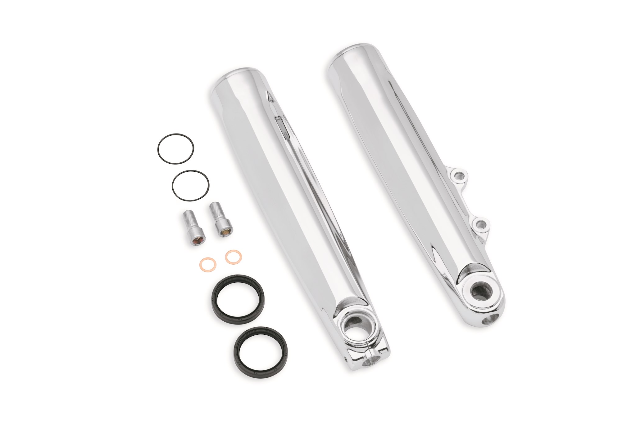 These chrome-plated Lower Fork Sliders give your bike upfront style. To ensure proper fitment and function, these sliders are manufactured from Original Equipment components. Form follows function, with polished, chrome-plating and a stamped Harley-Davidson logo for product identification. A perfect addition during the installation of Profile™ Low Front suspension components, this kit includes right and left sliders, bottom axle retainer, axle retainer bolts and oil seals.