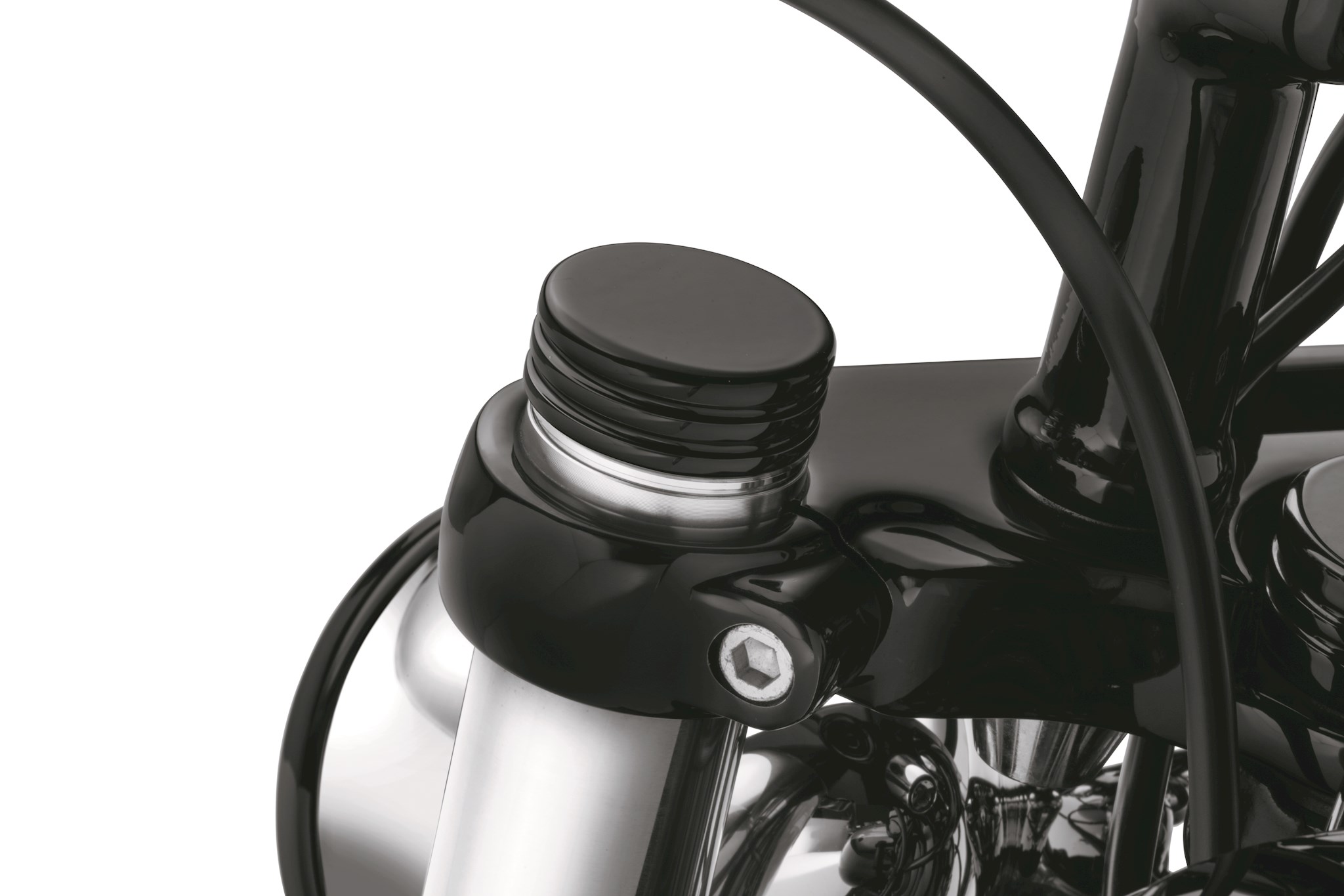 Top it off with style. These easy to install Fork Stem Covers complement the Defiance Collection to the top of the triple tree for a cohesive look. The deep radial grooves define the style, and the choice of chrome, black or machine cut finishes complement your bike’s polished, chrome or blacked-out front end components. Sold in pairs.