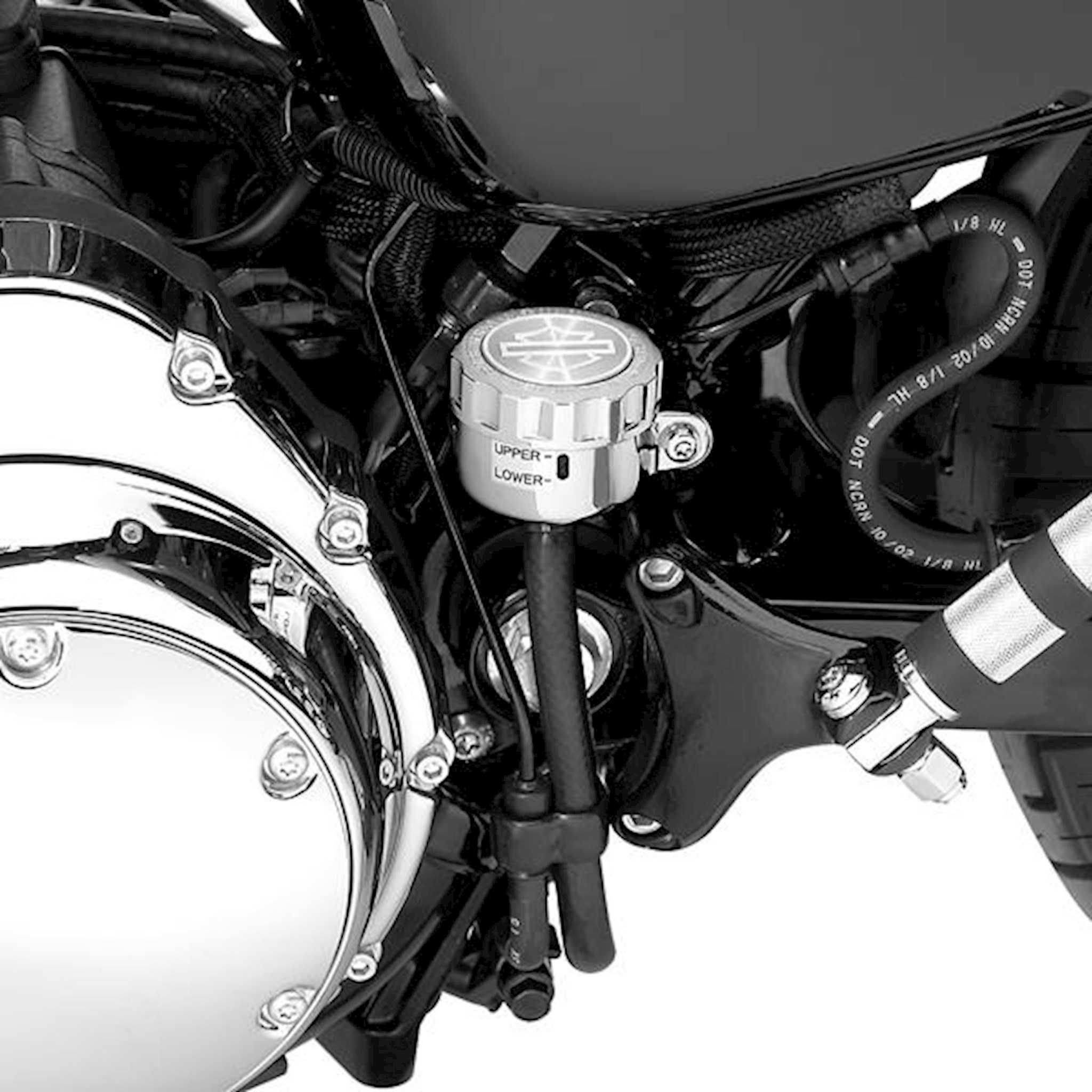 Dress the remote brake fluid reservoir with a new chrome skin. Kit includes chrome top cover with Bar & Shield medallion, reservoir side cover, chrome hardware and a Torx® wrench for easy installation.