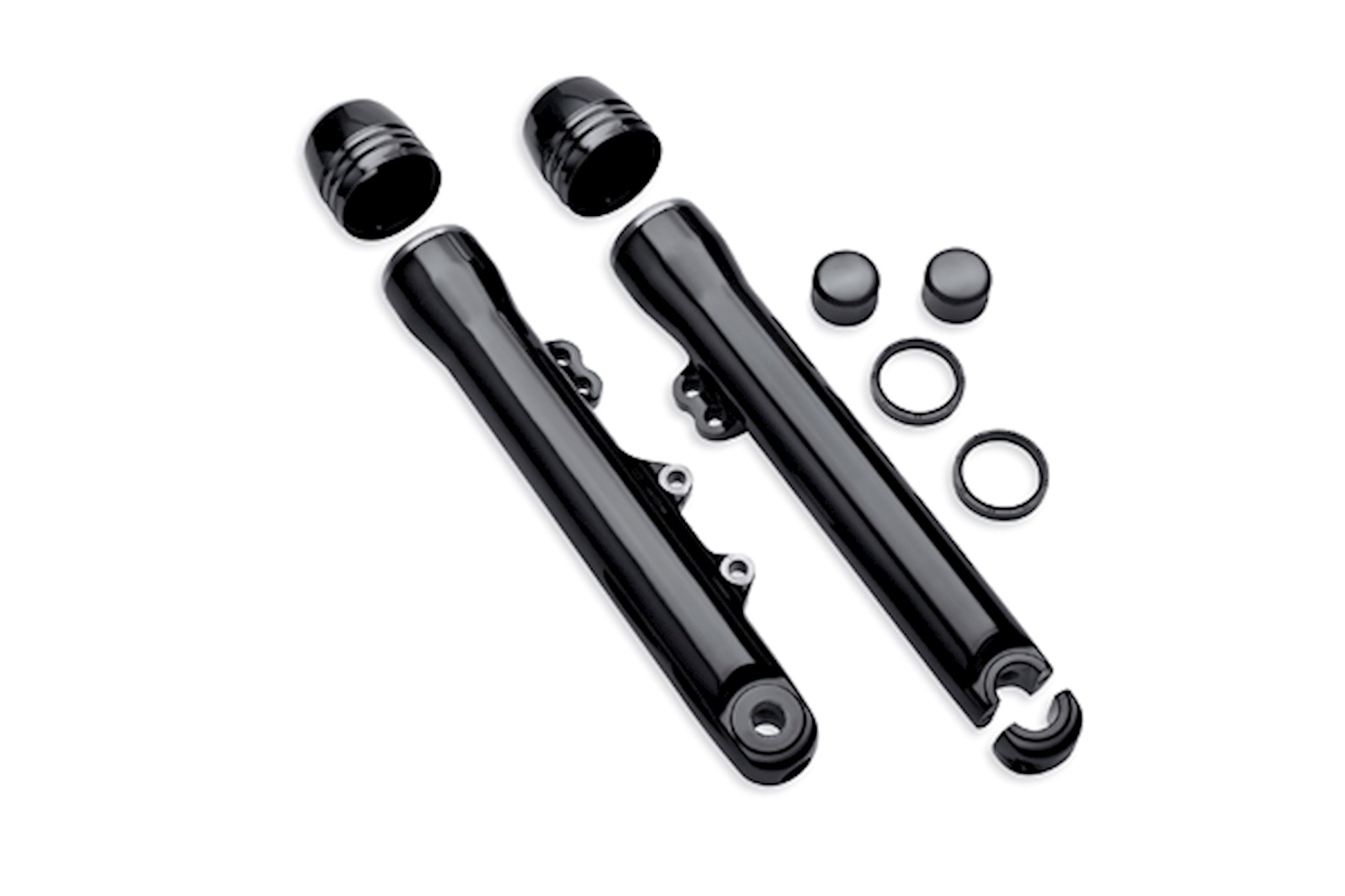 Lead the way to the dark side. This complete blacked-out Front End Kit includes all the major components required to convert the Original Equipment satin-finished front end to a dark custom style. A perfect addition during the installation of Profile Low Front suspension components, the kit includes gloss black fork sliders, gloss black fork dust covers and gloss black front axle nut cover kit.