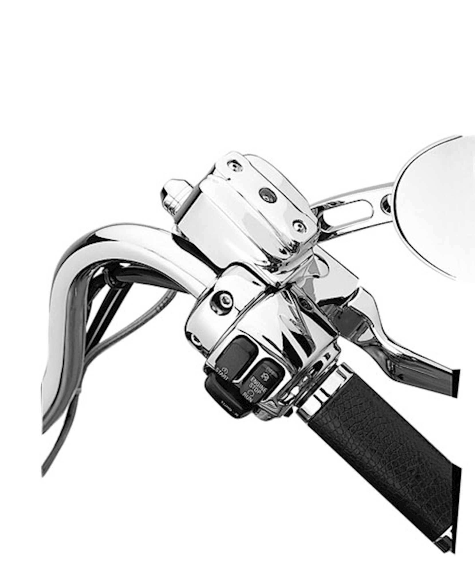 This kit includes a chrome-plated clutch bracket, handlebar control clamps, master cylinder cover and hardware to completely finish chroming the hand controls. Combine with chrome-plated Switch Housing Kit P/N 70222-96B to finish the look. Cannot be used with Auxiliary Lighting Kits.
