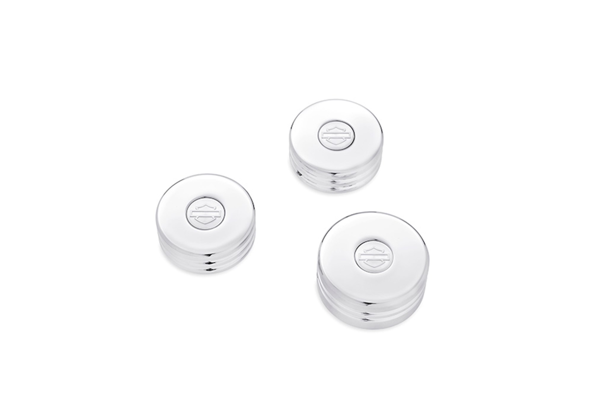 Highlighted with a unique Bar & Shield logo, these easy-to-install billet-look covers hide the Original Equipment fork and steering stem hex-head hardware and add a clean custom touch to the top of the triple tree. Available in your choice of chrome or gloss black finish, the kit comes complete with three covers and mounting hardware.