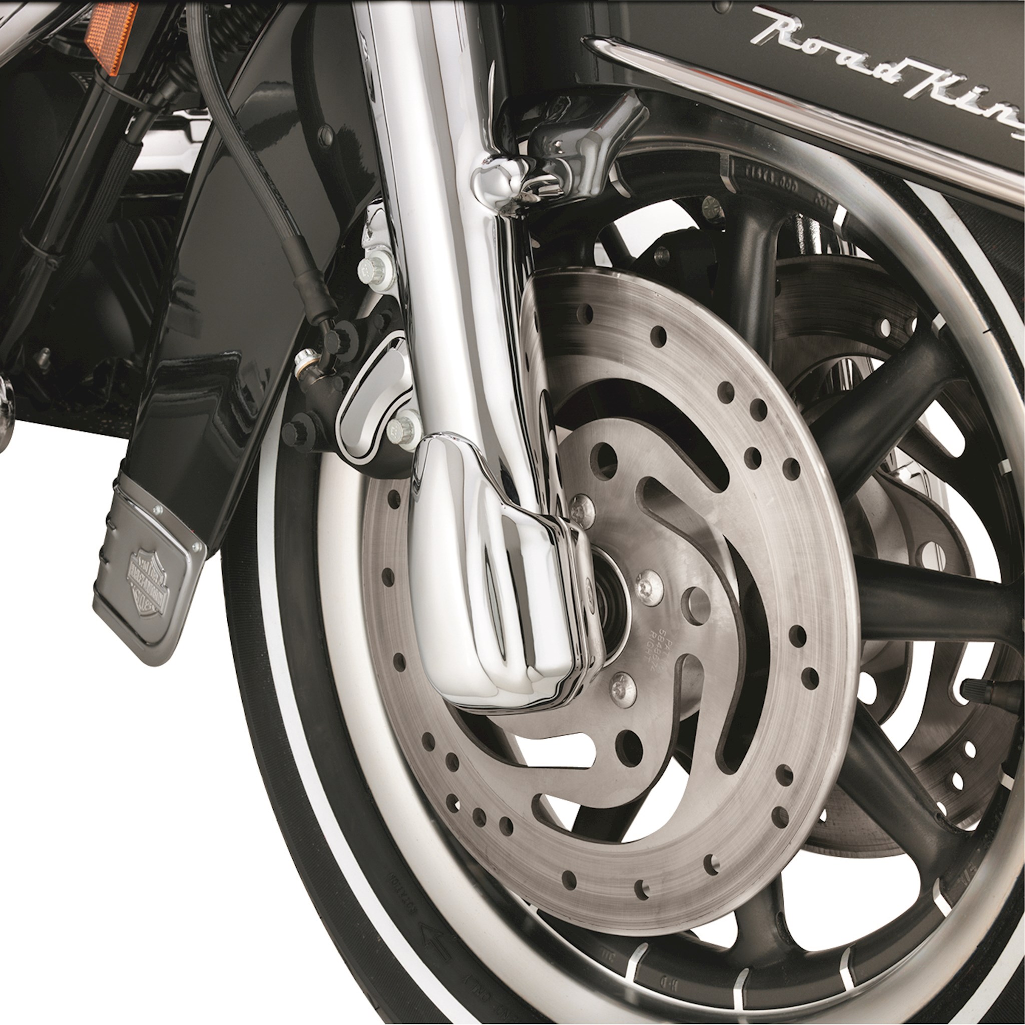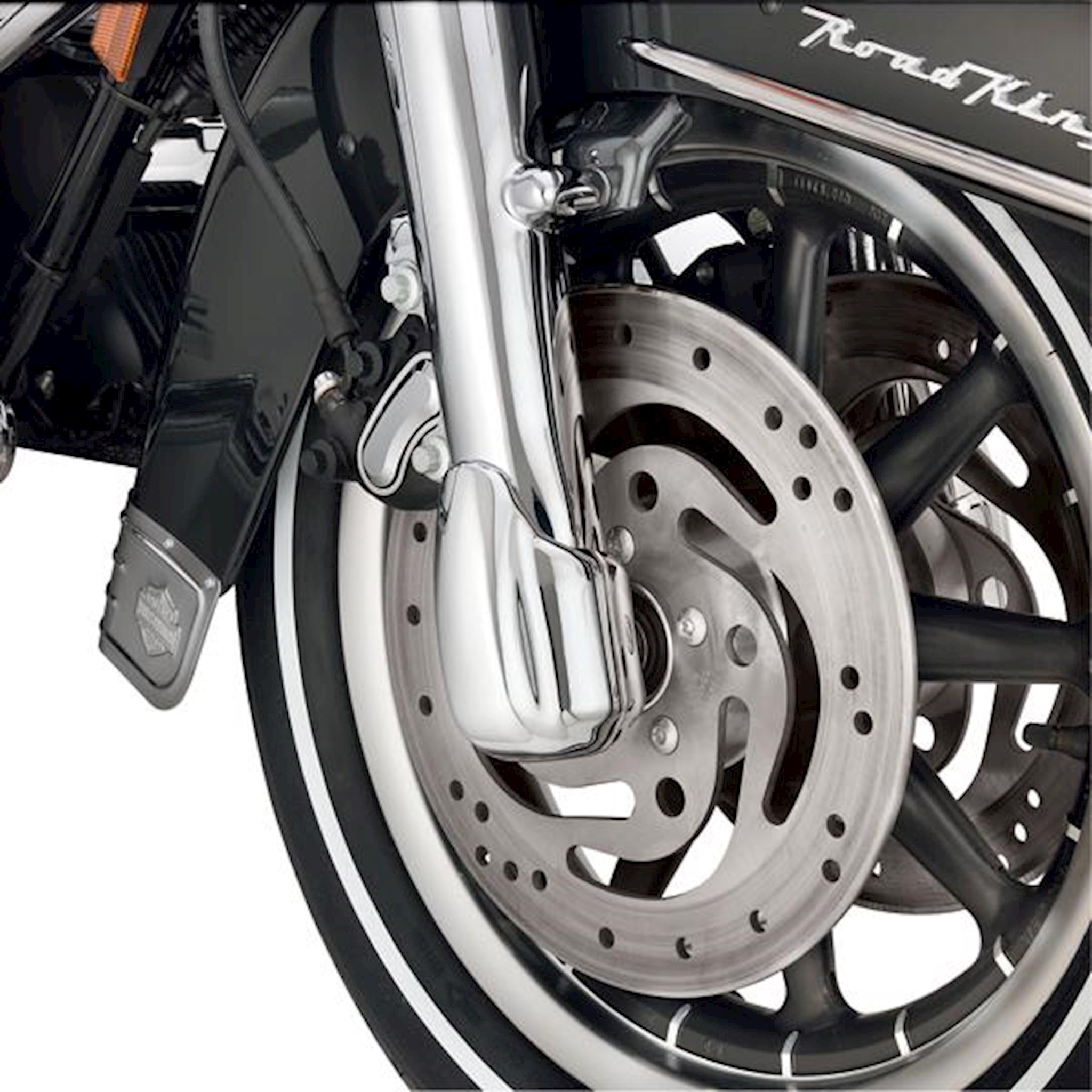 Lead the way with chrome. This Fork Slider End Cover Kit is contoured to complement the shape of the front fork slider. Designed to conceal the front axle and fork slider hardware, the smooth chrome surface complements both Original Equipment satin finish and accessory chrome lower fork sliders. Complete kit includes all necessary installation hardware.