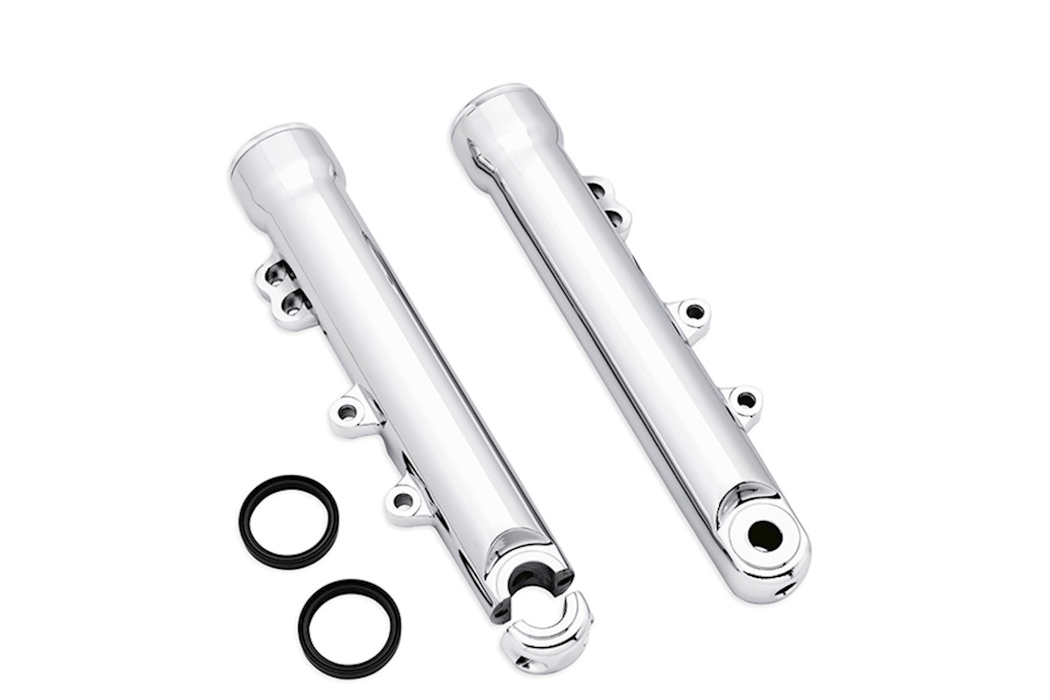 Competitively priced, these chrome-plated Lower Fork Sliders give your bike upfront style. To ensure proper fitment and function, these sliders are manufactured from Original Equipment components. Form follows function, with polished triple chrome-plating and a stamped "Harley-Davidson" logo for product identification. Kit includes right and left side sliders.