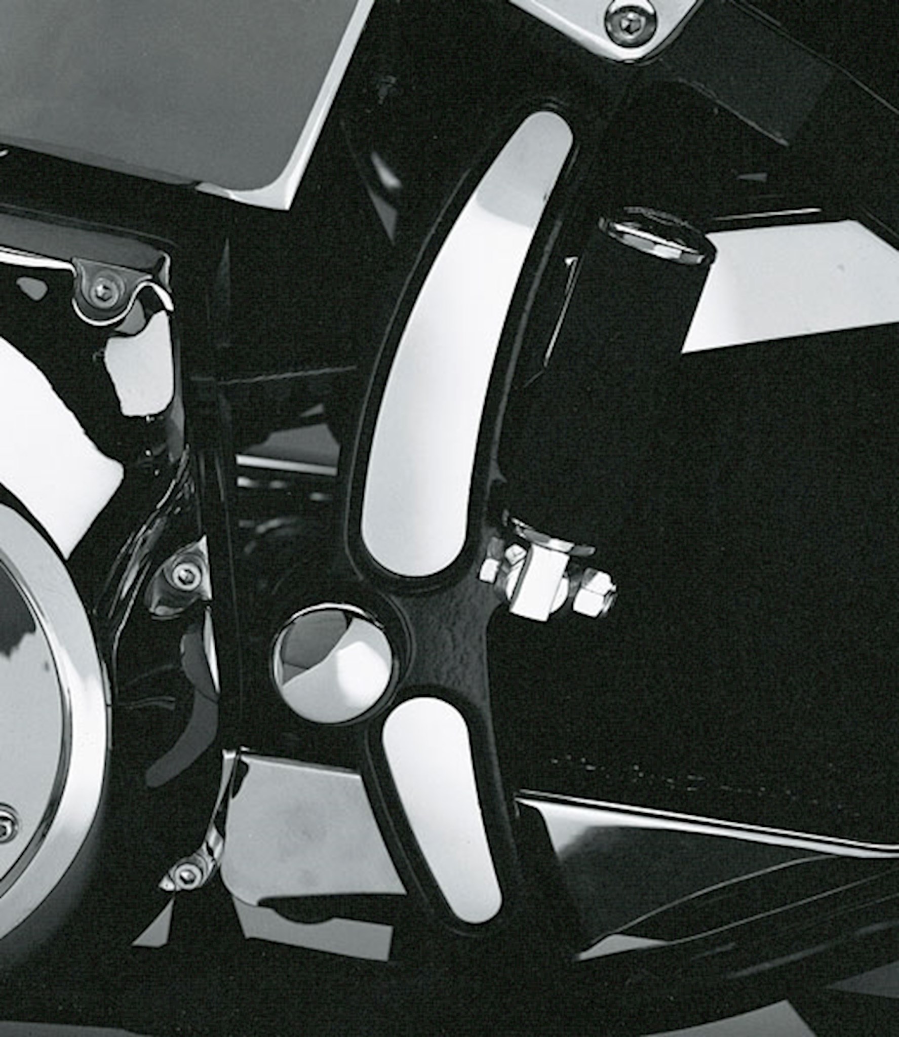 Easy-to-install chrome-plated trim plates fit into recesses on rear of Softail frame near swingarm pivot. Comes with double-sided adhesive tape. Adds a finishing touch. (Shown with Chrome Swingarm Pivot Cover P/N 43897-86B, sold separately.)