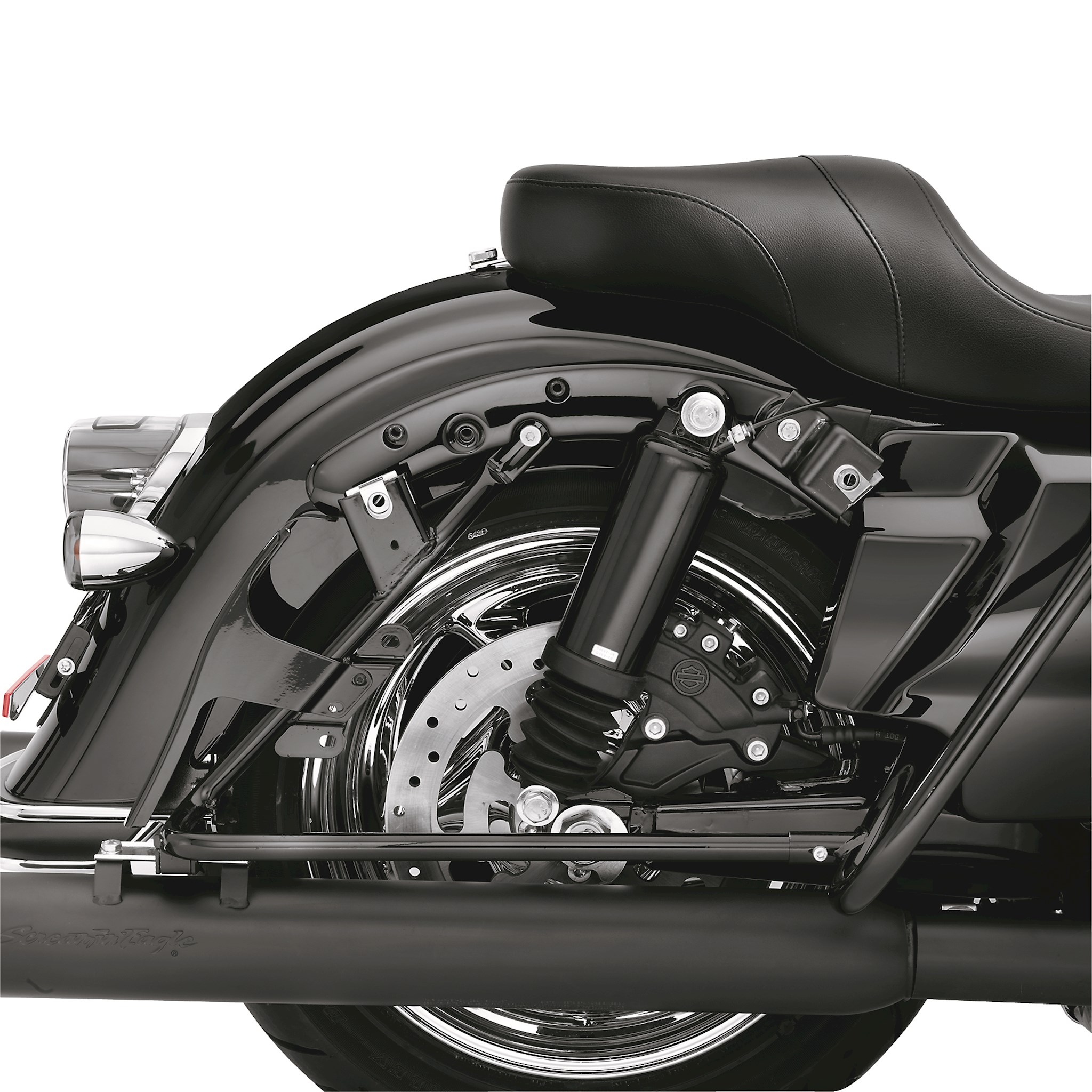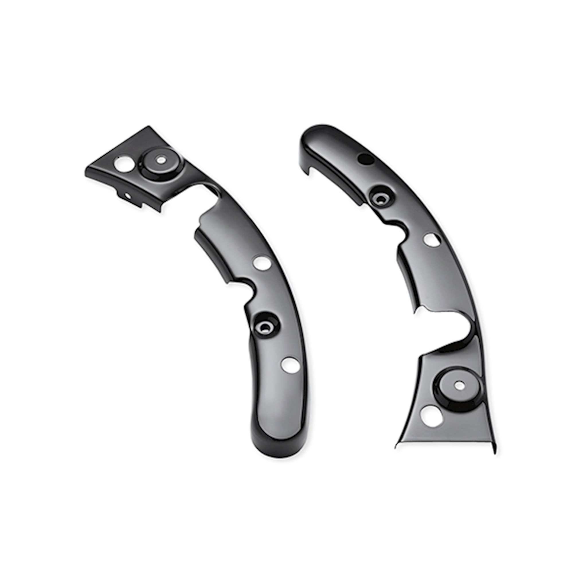 Manufactured from Original Equipment components to ensure superior fit and finish, the gloss black Fender Strut Covers conceal the cast fender struts and continue the dark look to the area behind the saddlebags. The ideal finishing touch for your "blacked-out" Touring bike, these covers are the perfect complement to the optional gloss black Passenger Sissy Bars, Stealth Luggage Rack and Docking Hardware Kits.