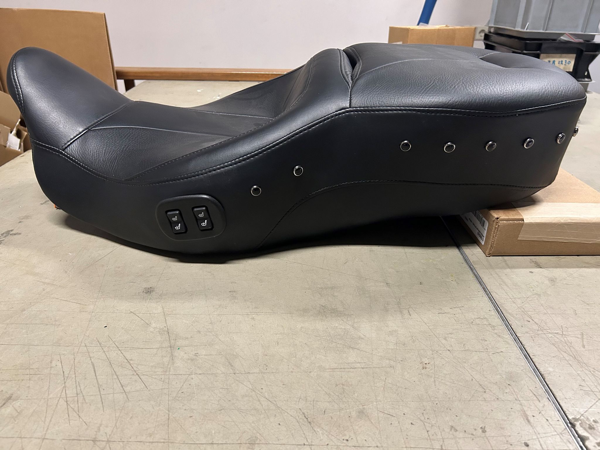 The one-piece "Super" comfortable touring design provides the rider and passenger with the fullest, most comfortable seat possible and sits the driver 1.75" further back than the stock seat. Seat will fit with a handrail. Will not work with Harley Davidson® or Mustang Driver Backrest kits. Receiver for the driver backrest is built into the seat. All heated seats come complete with a wire harness that hooks to the accessory port in front of the battery. This part is energized only when the ignition key is turned on and the accessory toggle switch below the handlebars is flipped up. Features: Dual zone high/low settings for Driver and Passenger on the side of the seat; Illuminated switches; Does not require any OE controllers or switches to function. Installation on 2014 FL Touring requires use of Harley adapter 69200722. If the accessory port is already in use, install Harley adapter 70270-04 to add additional ports. Front Width: 19" Rear Width: 14"