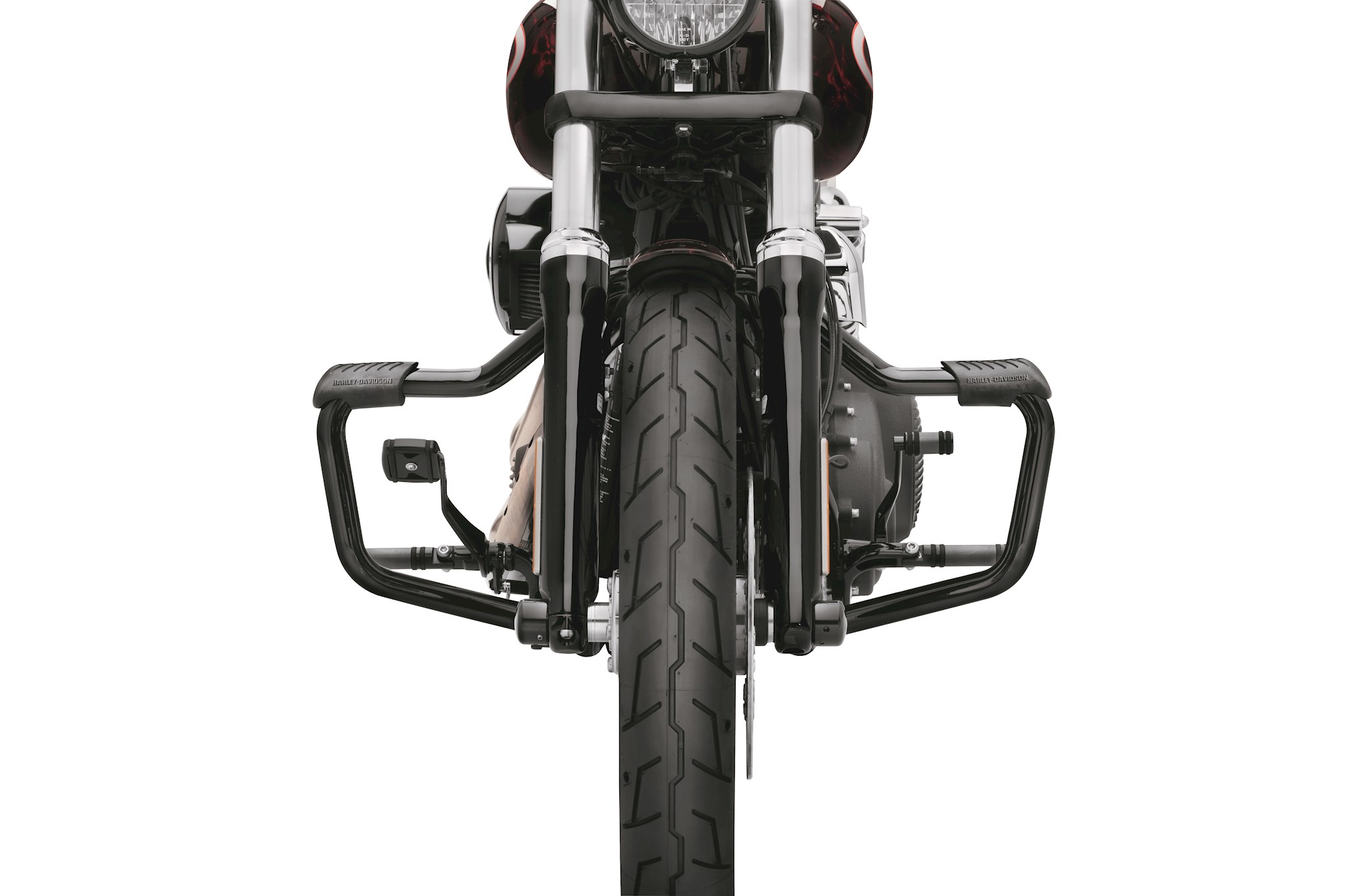 Combine classic shape and modern function for a unique twist on engine protection. The flow of this engine guard complements the bike's traditional style while the gracefully curved upper section incorporates highway pegs into the shape. The integrated rubber pads offer a comfortable and slip-resistant cushion for your feet while traveling the open road. One-piece engine guard kit includes all required mounting hardware. Fits '06-later Dyna® models. '14-later FXDL and all '15-later Dyna models in India require separate purchase of Horn Relocation Bracket P/N 69000058. Fits with Oil Cooler Kit P/N 26151-07. FXDSE/2 and FXDFSE/2 requires removal of front chin spoiler and separate purchase of Regulator Caddy P/N 70464-08A. '06-'11 models equipped with evap canister also require separate purchase of Canister Bracket P/N 47207-06. '12-later models equipped with evap canister require separate purchase of Canister Relocation Kit P/N 60800005.