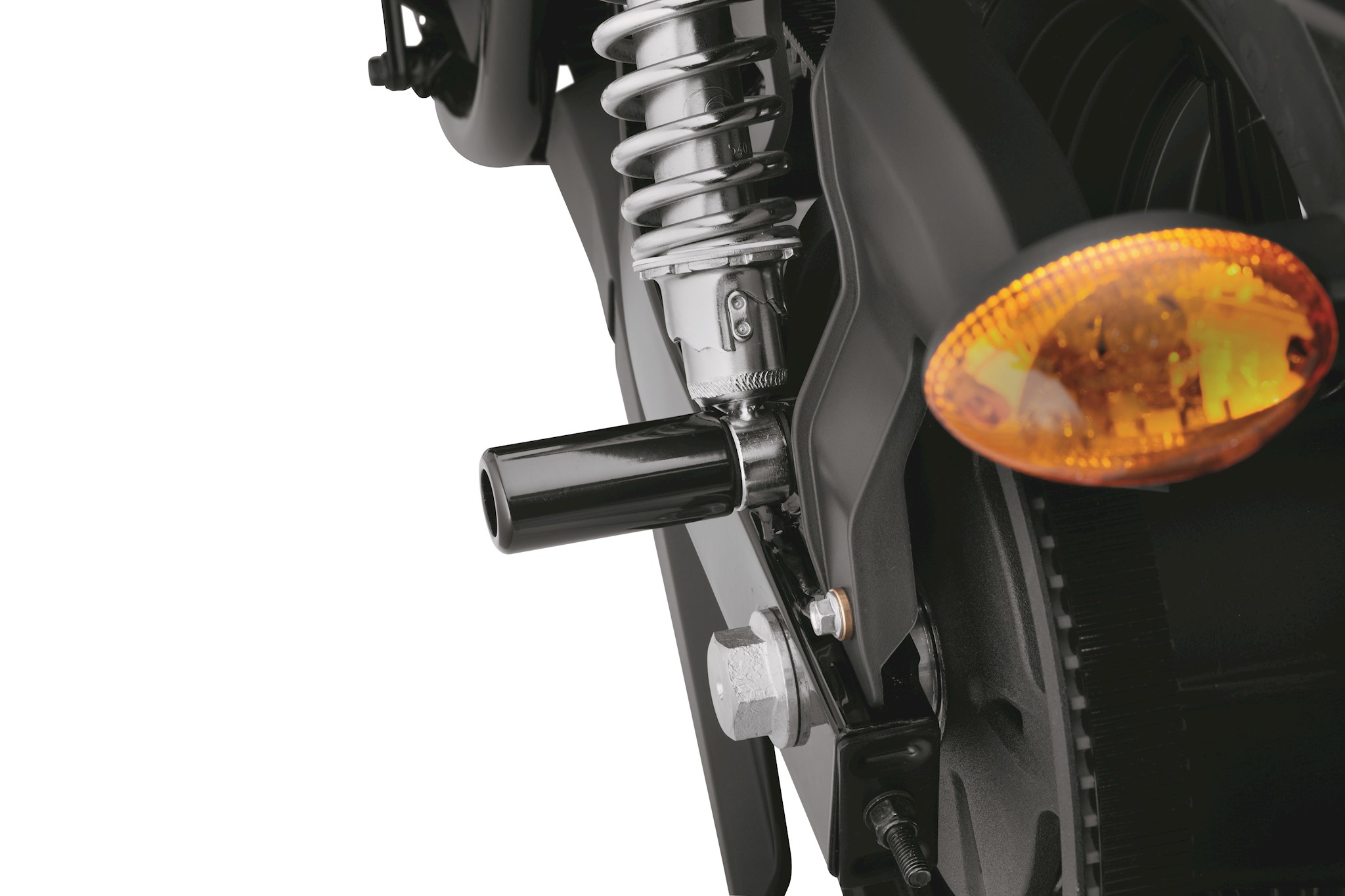 Soft asphalt, tight quarters, and inattentive car parkers are everyday threats to a motorcycle in the urban jungle. Stationary and low-speed tip-over incidents can cause significant damage to the bike’s painted parts, hand and foot controls, and the exhaust system. Now, you can provide cosmetic protection to some of the most costly components in the event of a vehicle drop, and safeguard your bike with this collection of cosmetic vehicle guards. Designed to protect the Swingarm, this Swingarm Guard replaces the lower shock bolt. The gloss black guard matches the finish of the swingarm and belt guard, and blends into the bike's profile for an unobtrusive look.